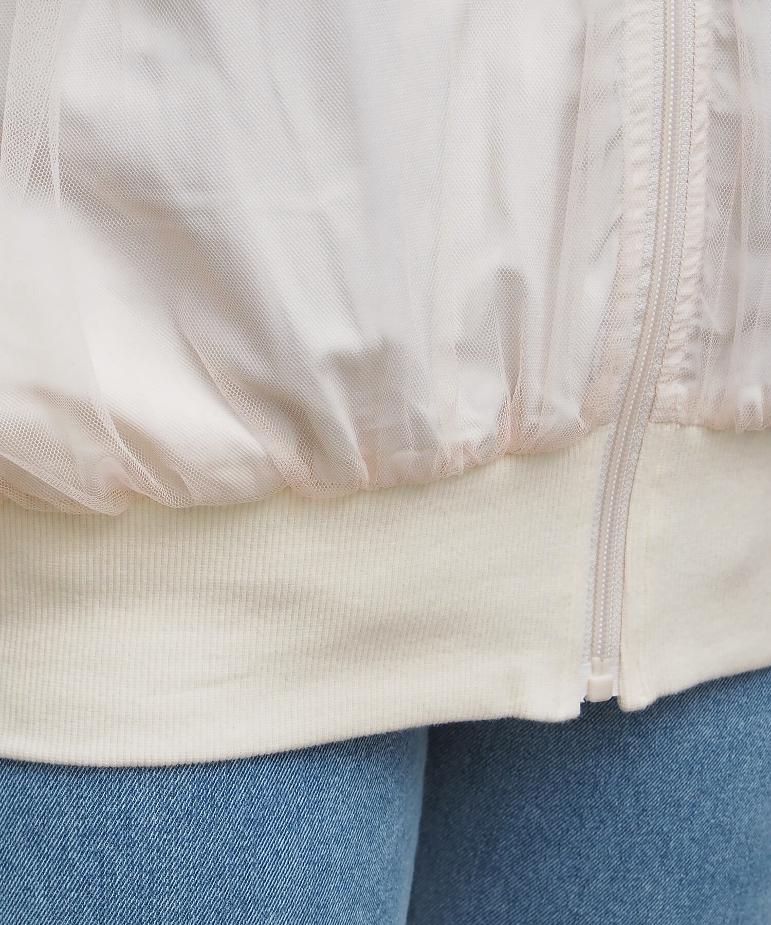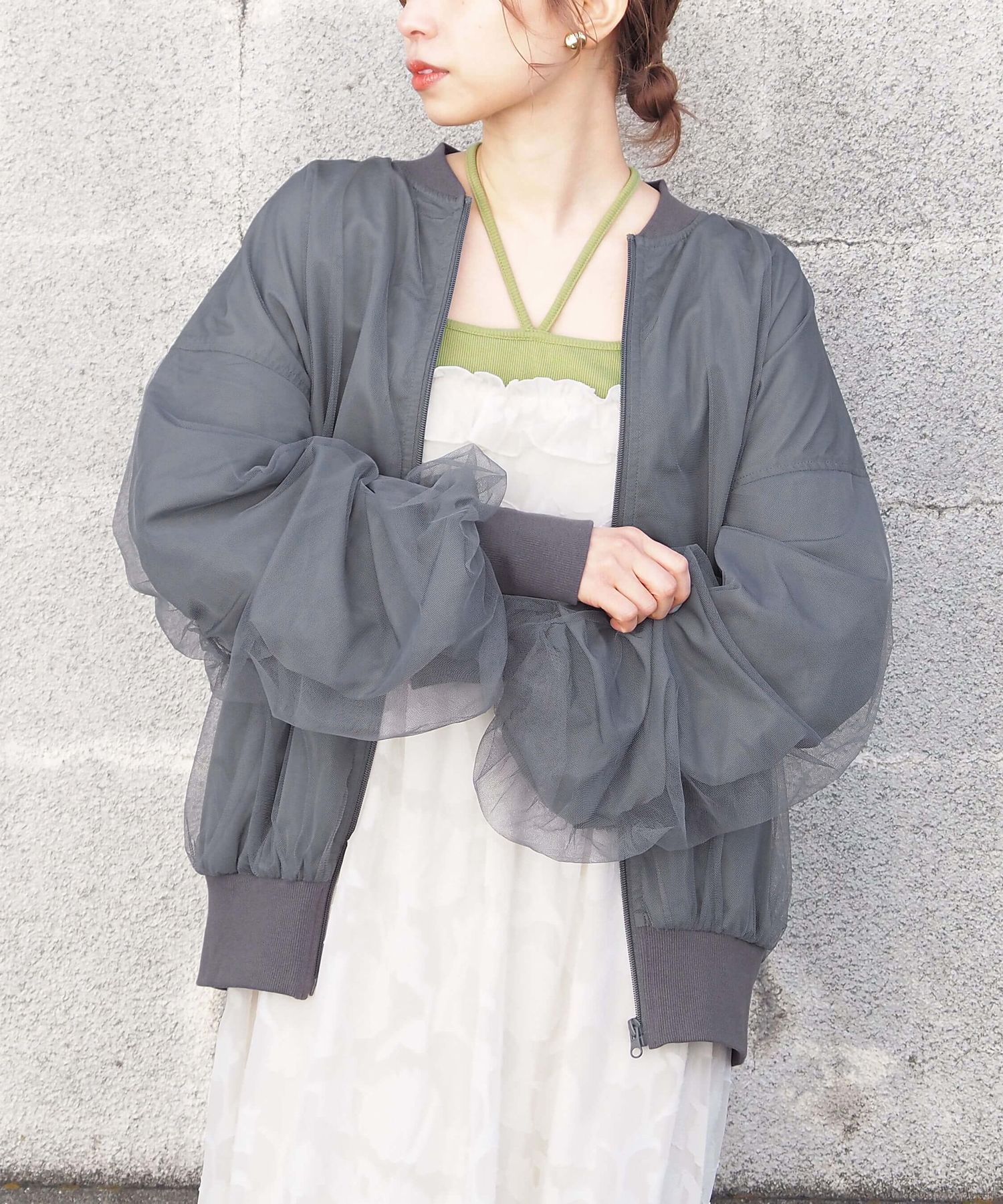 ・チュールの透け感はもちろん、軽さのあるブルゾンは春夏の着こなしに馴染みやすく、幅広い着回しが可能です。