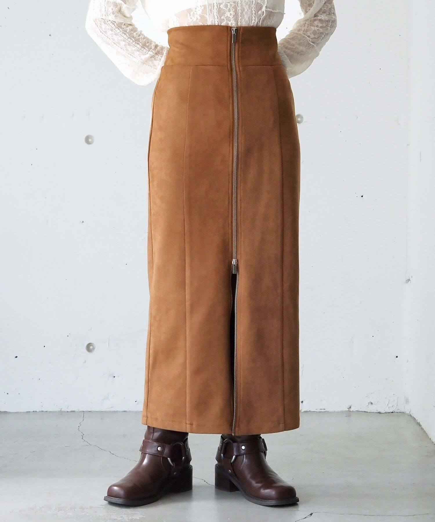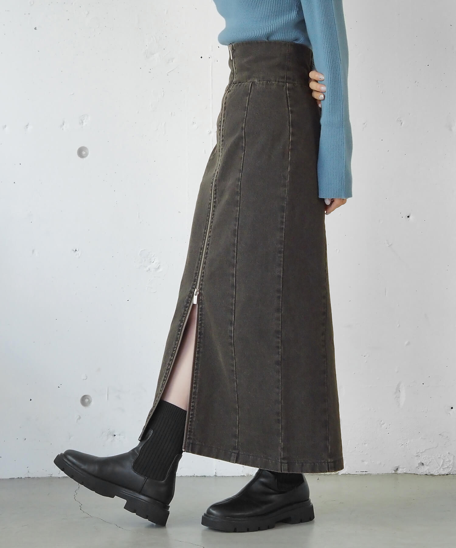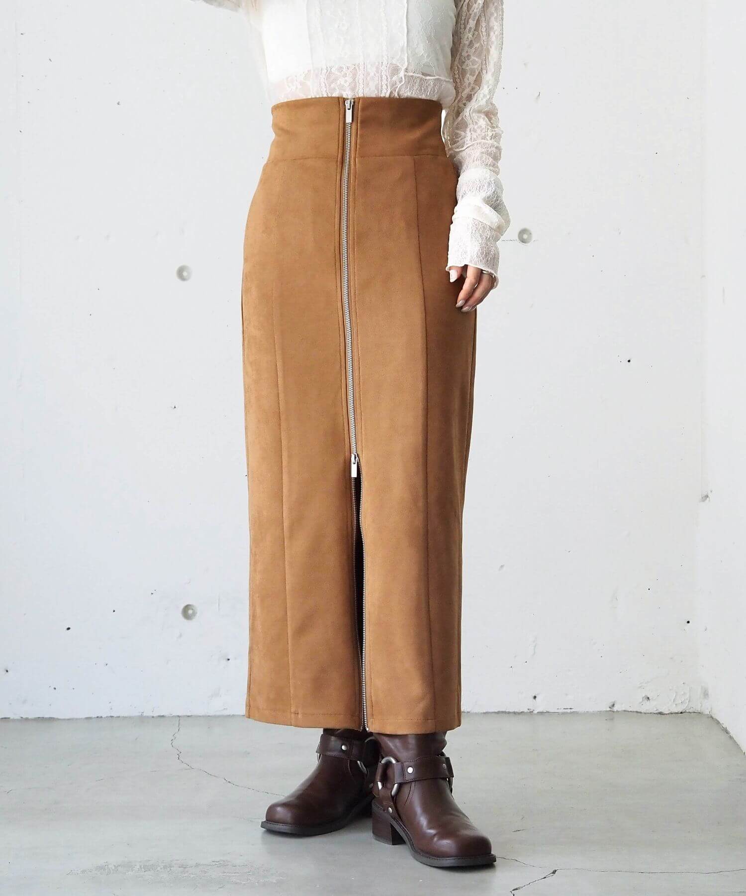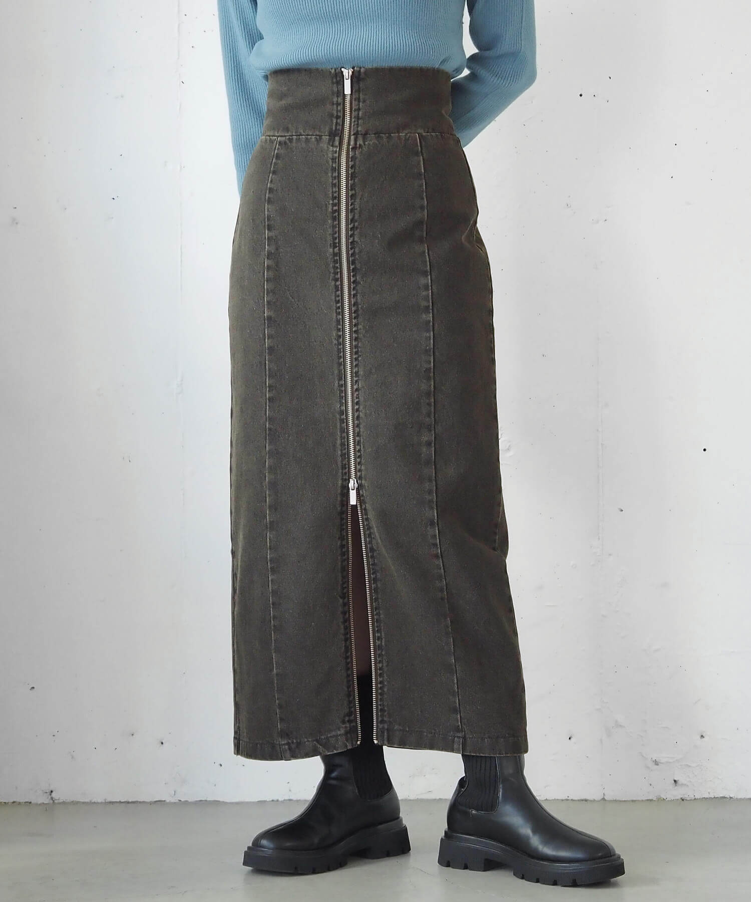 ・ジップの開け具合で印象を変えられるのはもちろん、足さばきもUPするので、タイトスカートながら履きやすい1枚です。