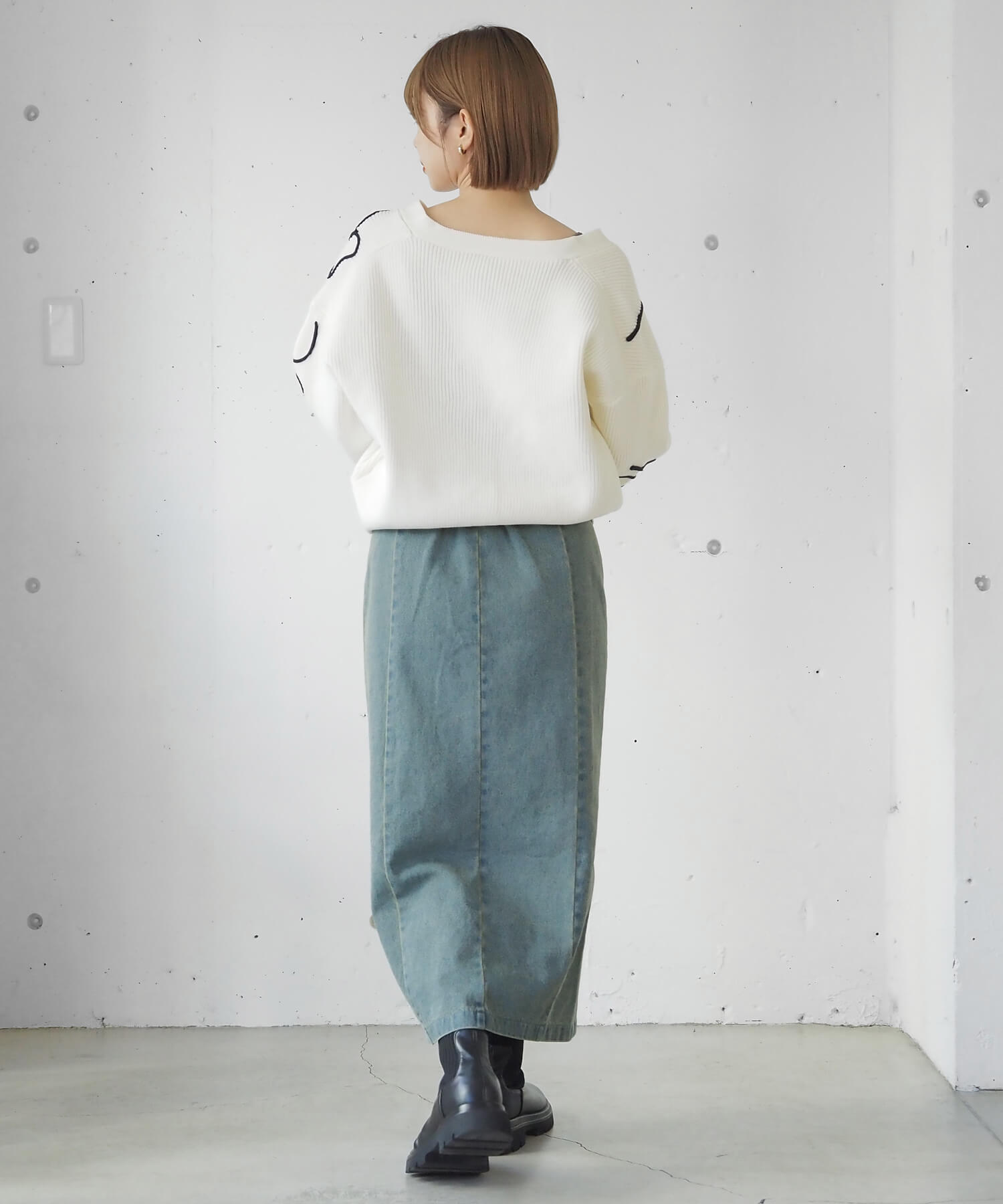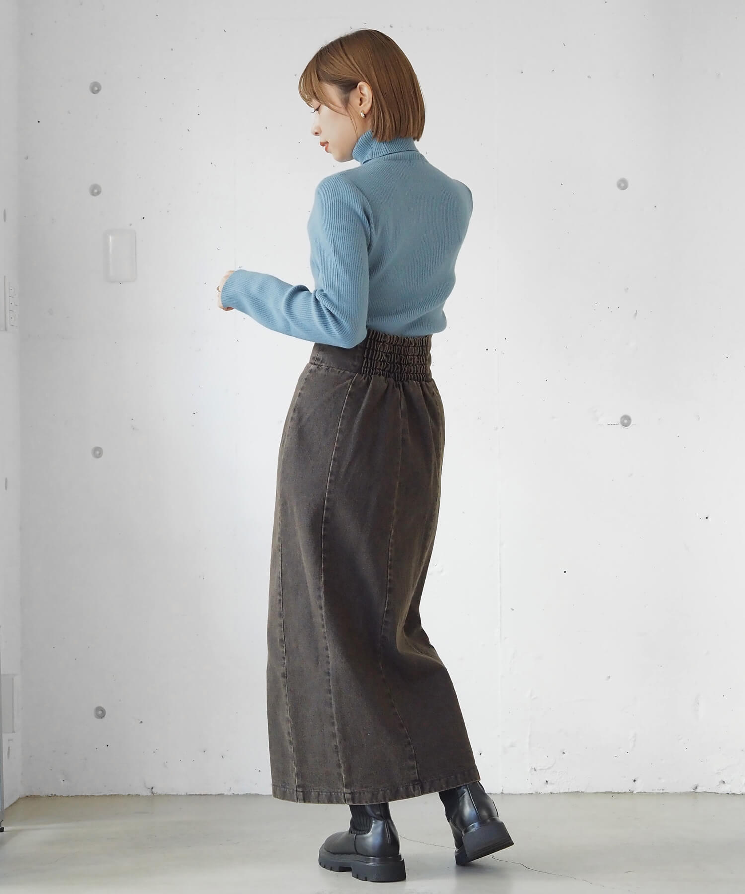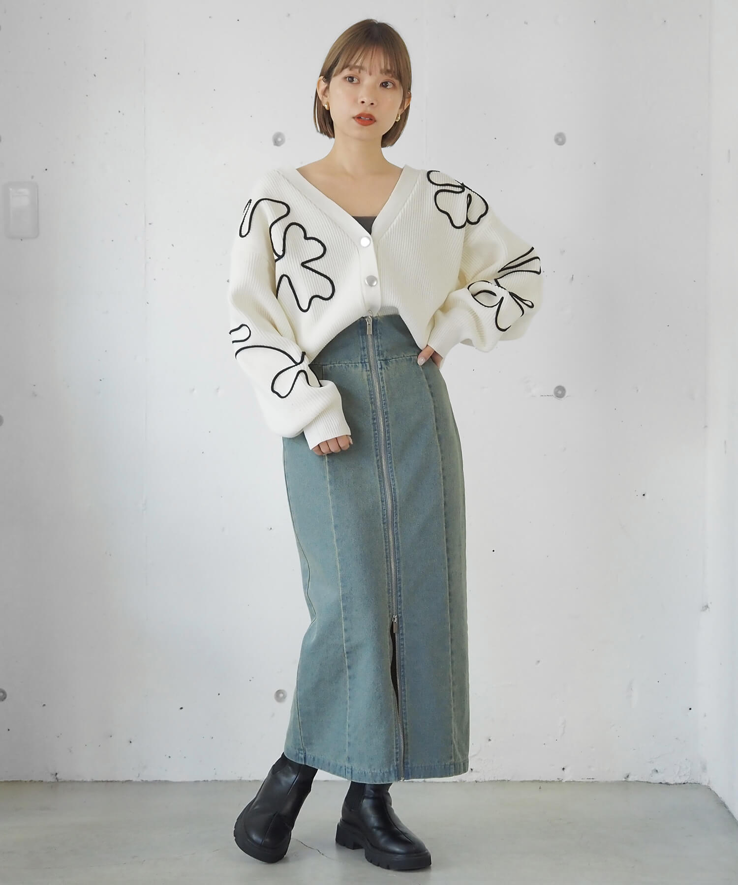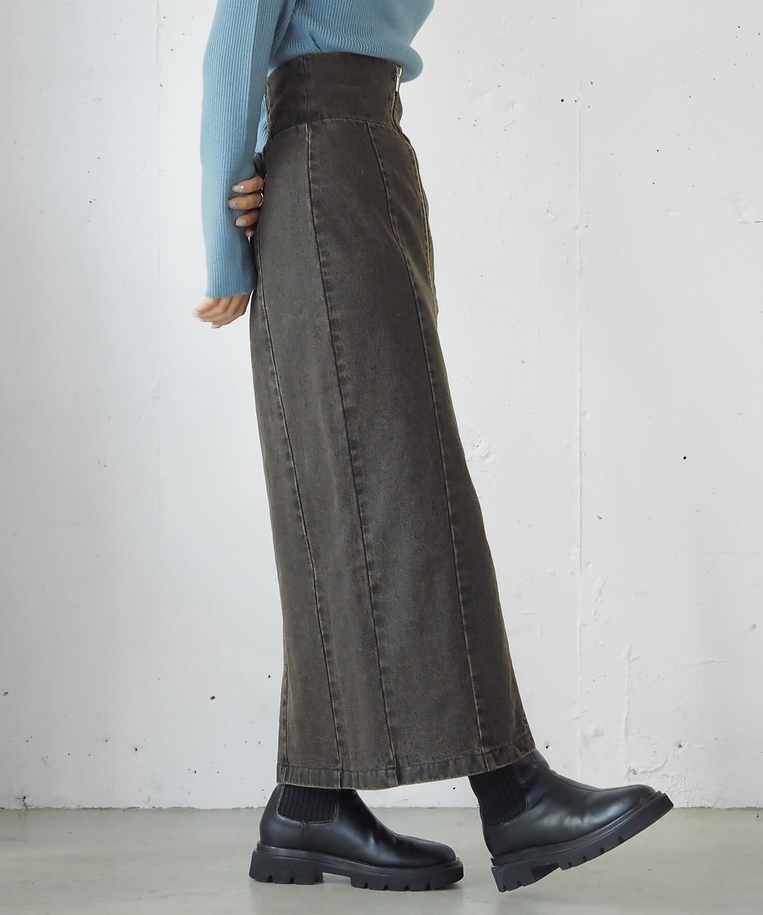 ・ジップの開け具合で印象を変えられるのはもちろん、足さばきもUPするので、タイトスカートながら履きやすい1枚です。