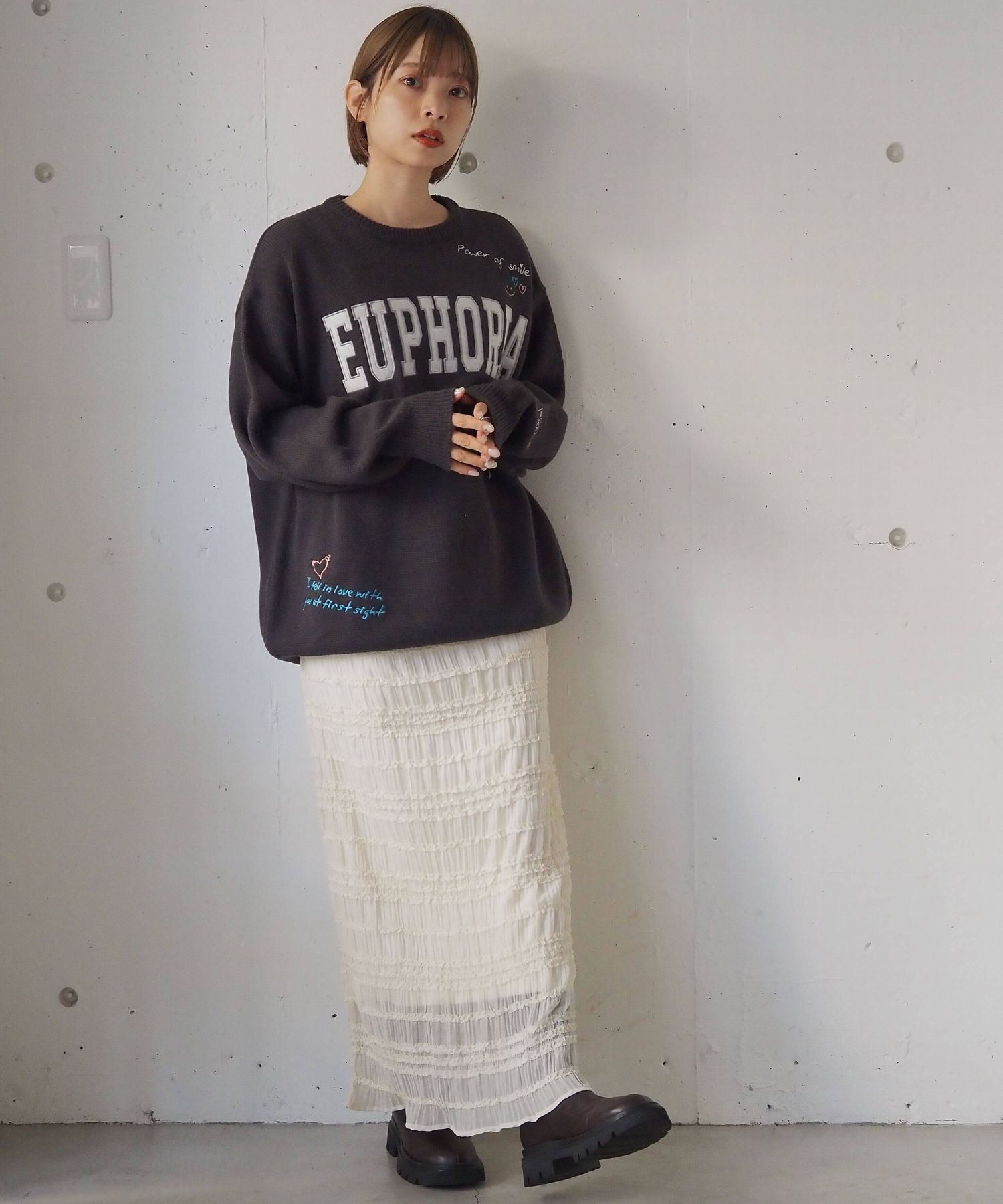 ・カジュアルなスウェットやニットにさりげない甘さをプラス。厚手のトップスに軽さのあるスカートがトレンドのコーティネートです。