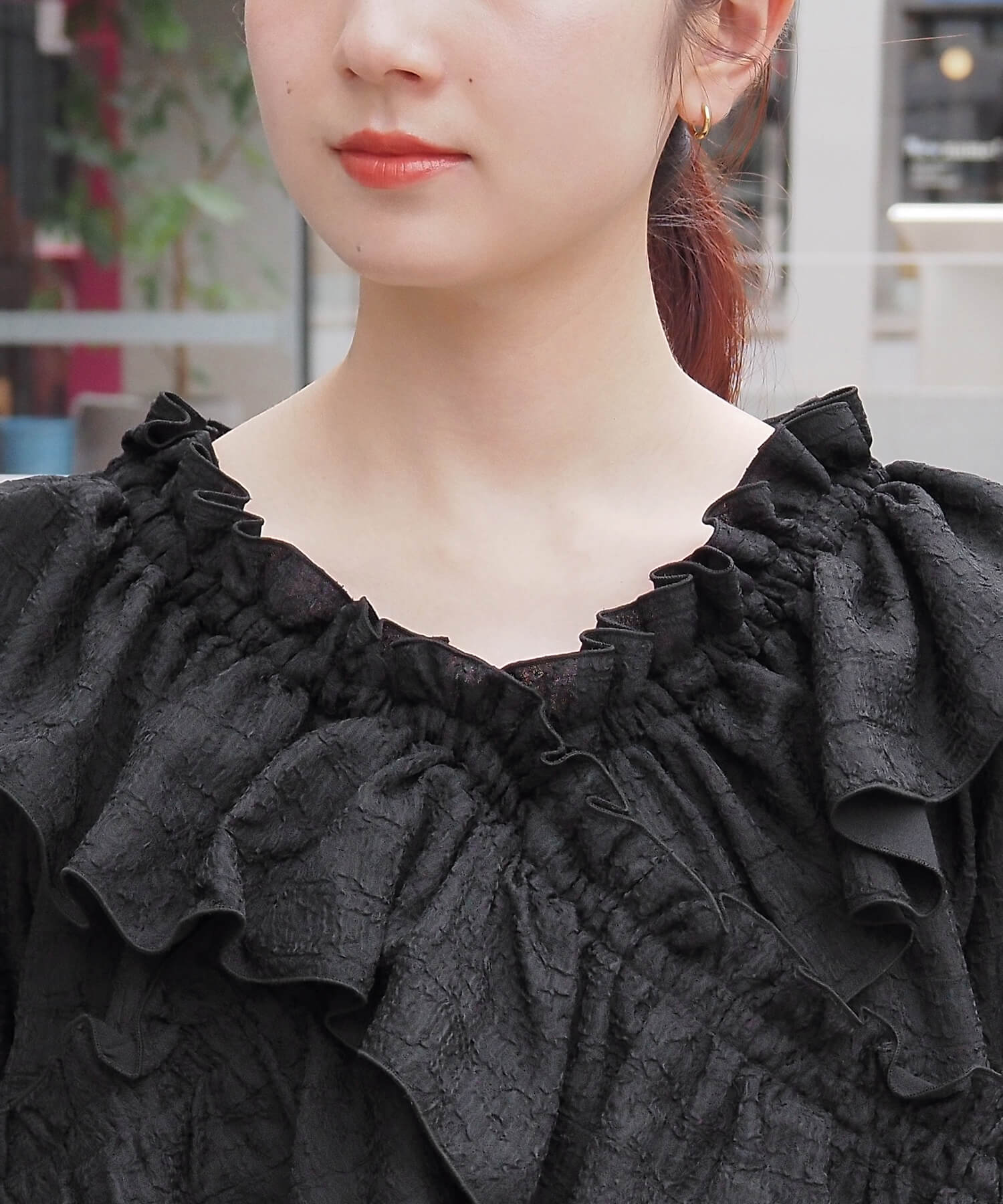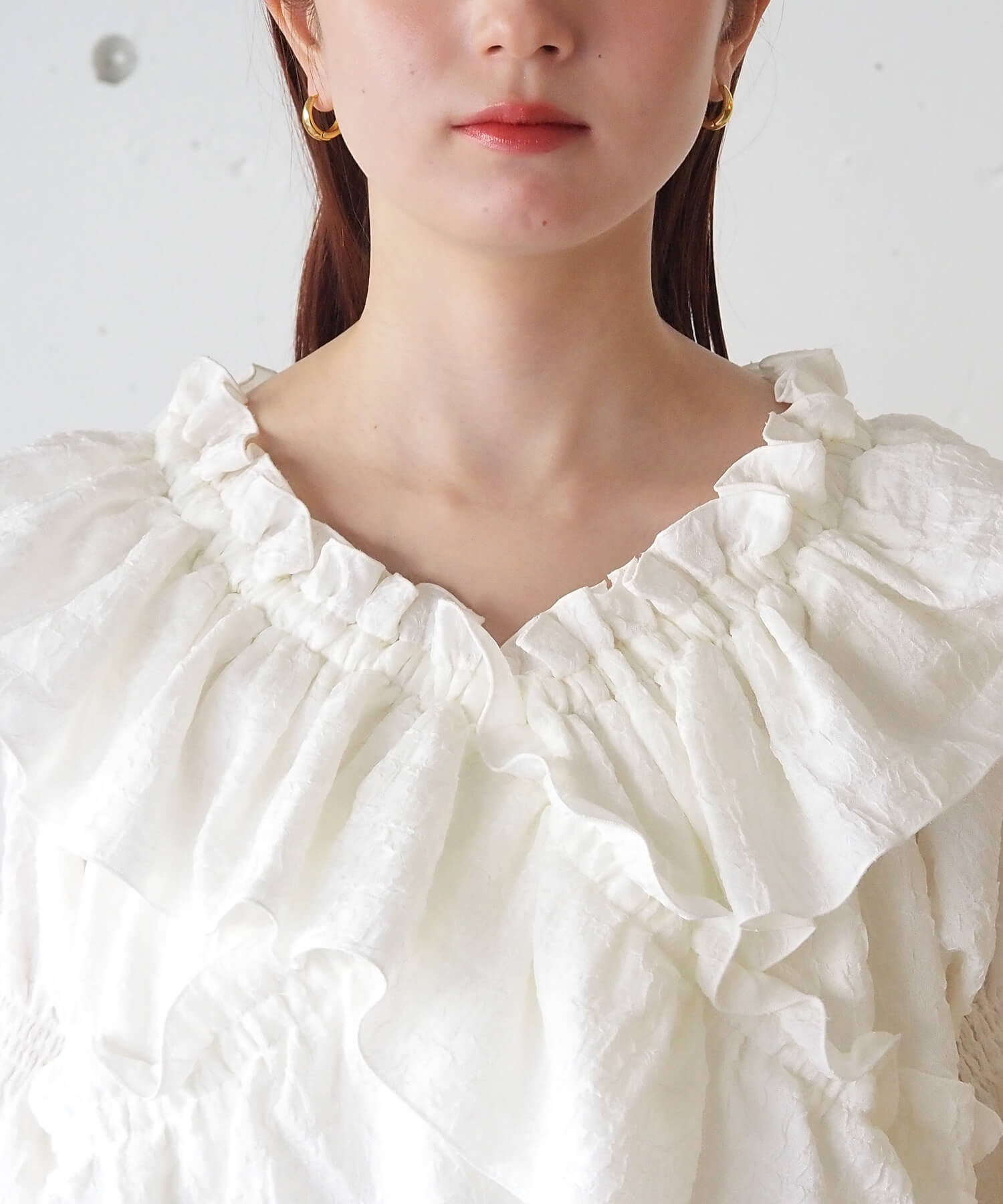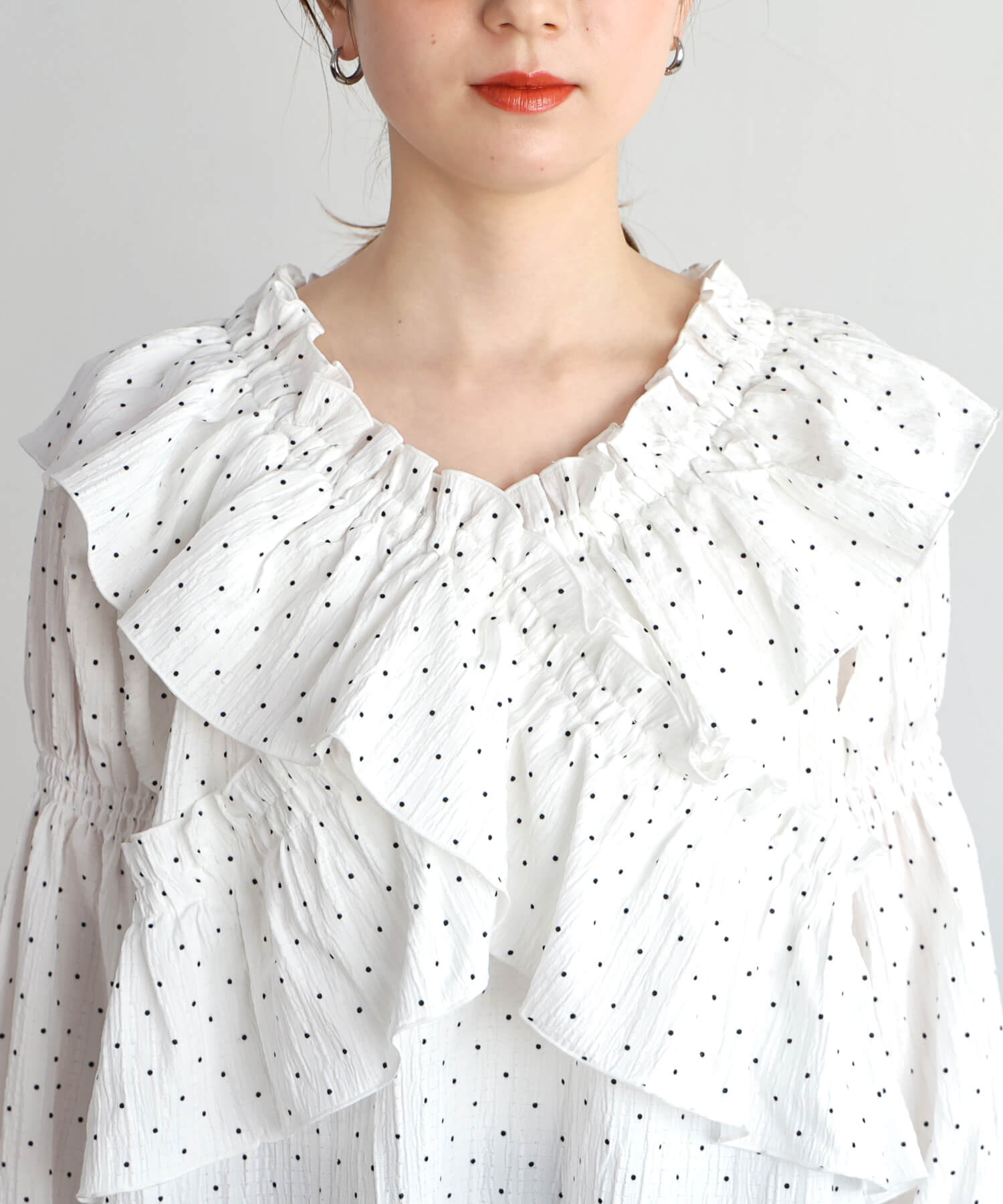 ・着るだけで映えるデザインブラウスなので、オールホワイトやオールブラックなど、ワントーンコーデも印象的に決まります。