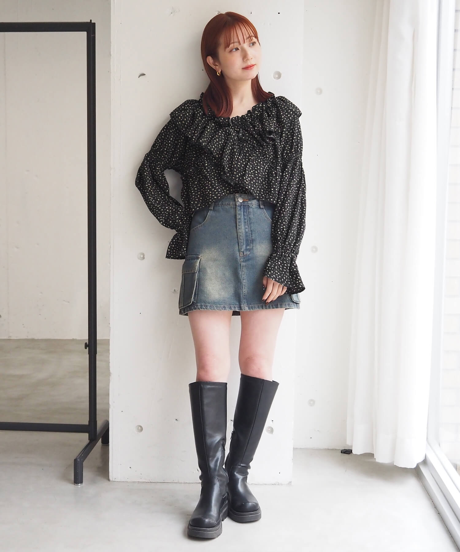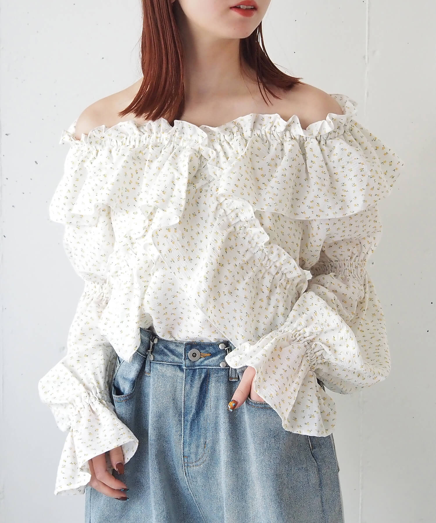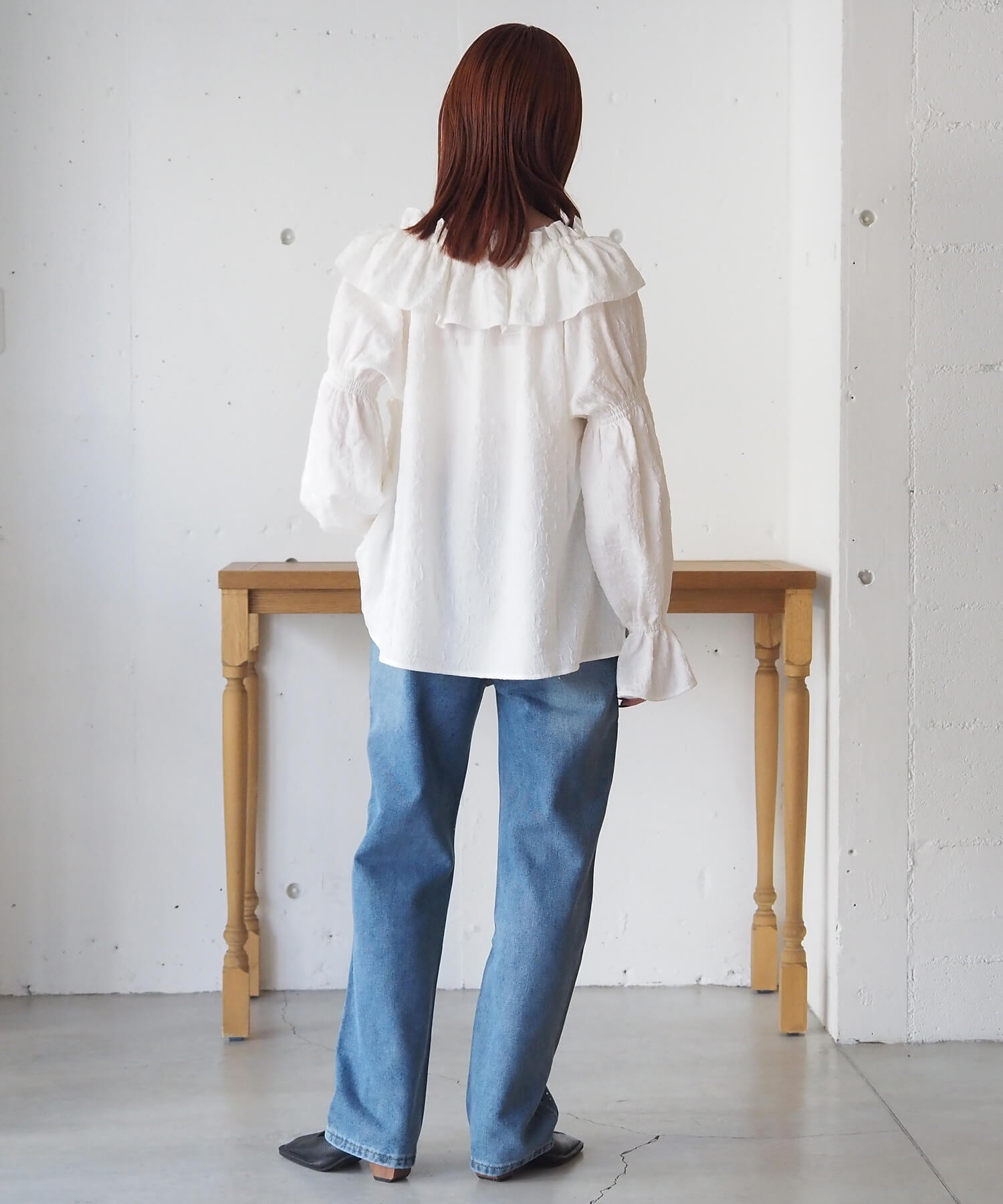 ・ガーリーなフリルブラウスをデニムでカジュアルに。程よい抜け感で甘過ぎない着こなしに。