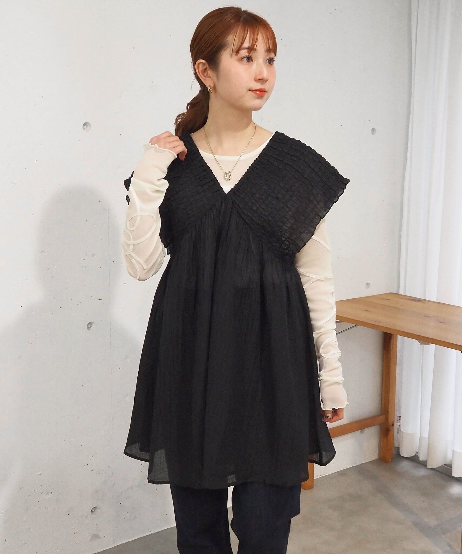 ・ロンTやハイネックトップスとのレイヤードで秋冬も活躍します。