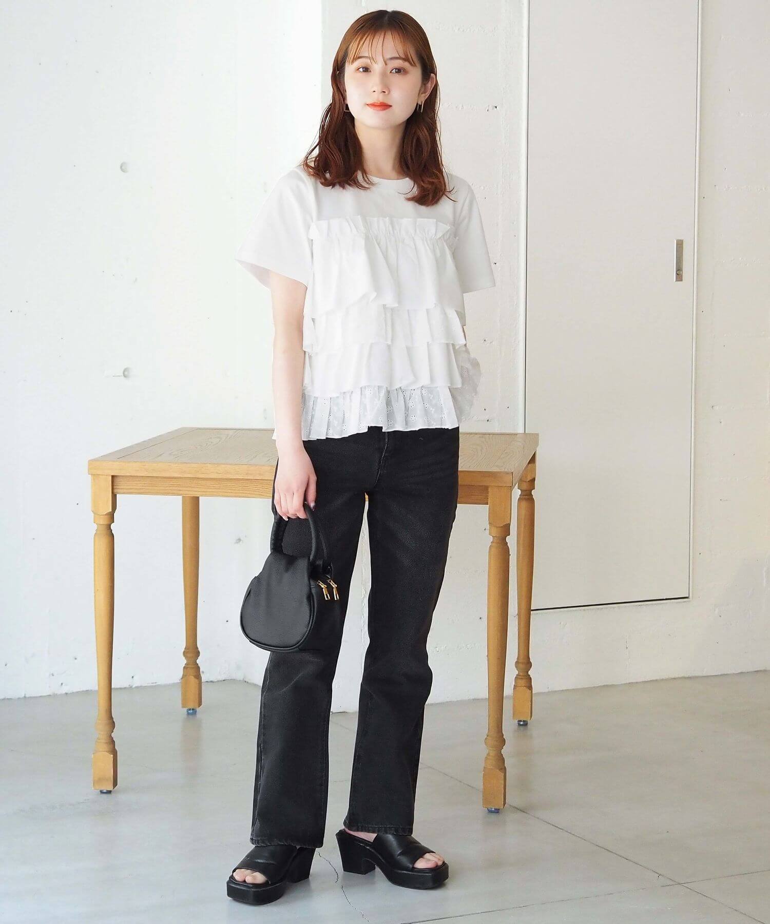 ・デニムでフリルをカジュアルダウン。夏らしい爽やかなスタイリングです。