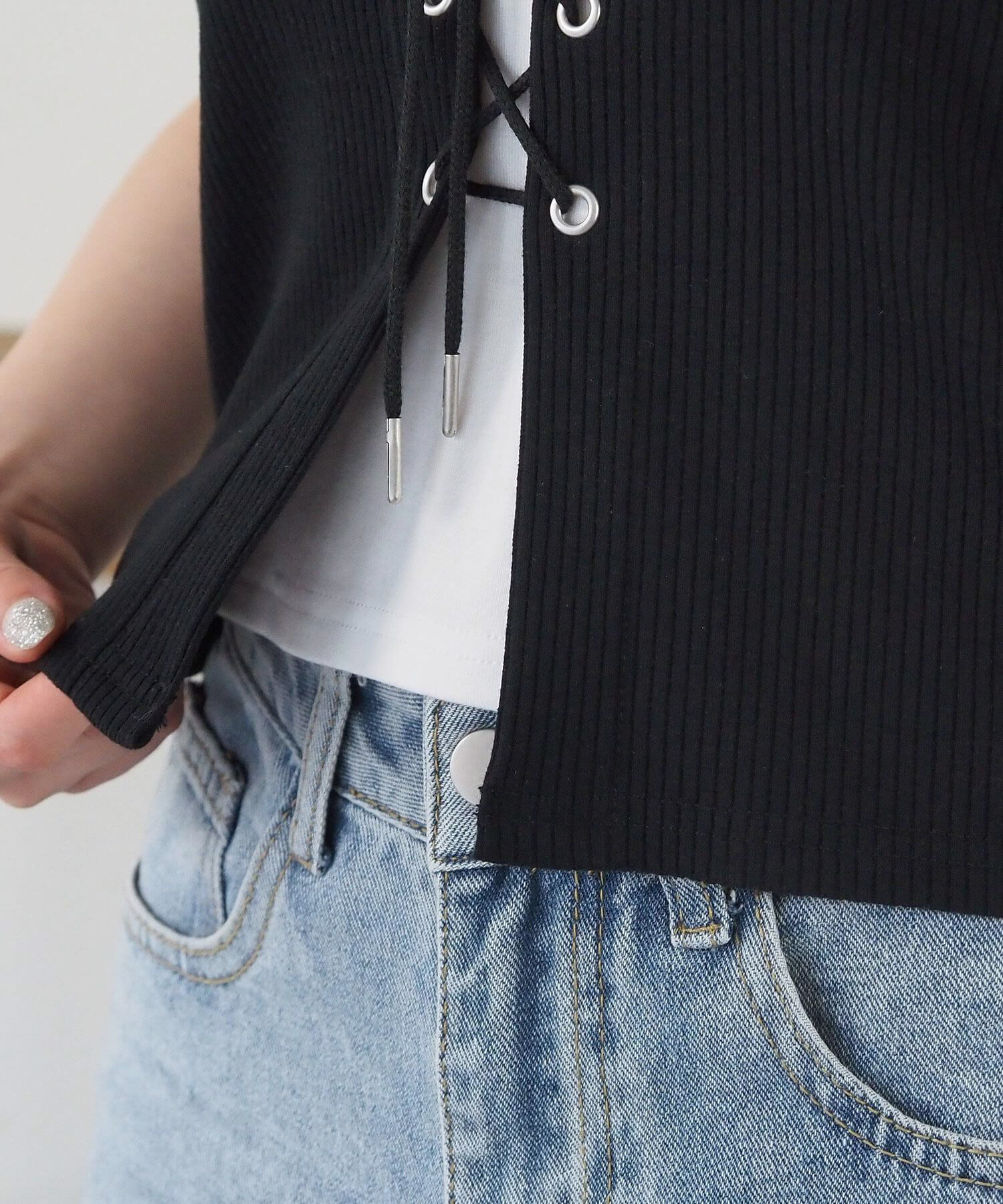 ・フロントのレースアップがコーディネートをひきしめ、1枚で着映えするのも嬉しいポイントです。