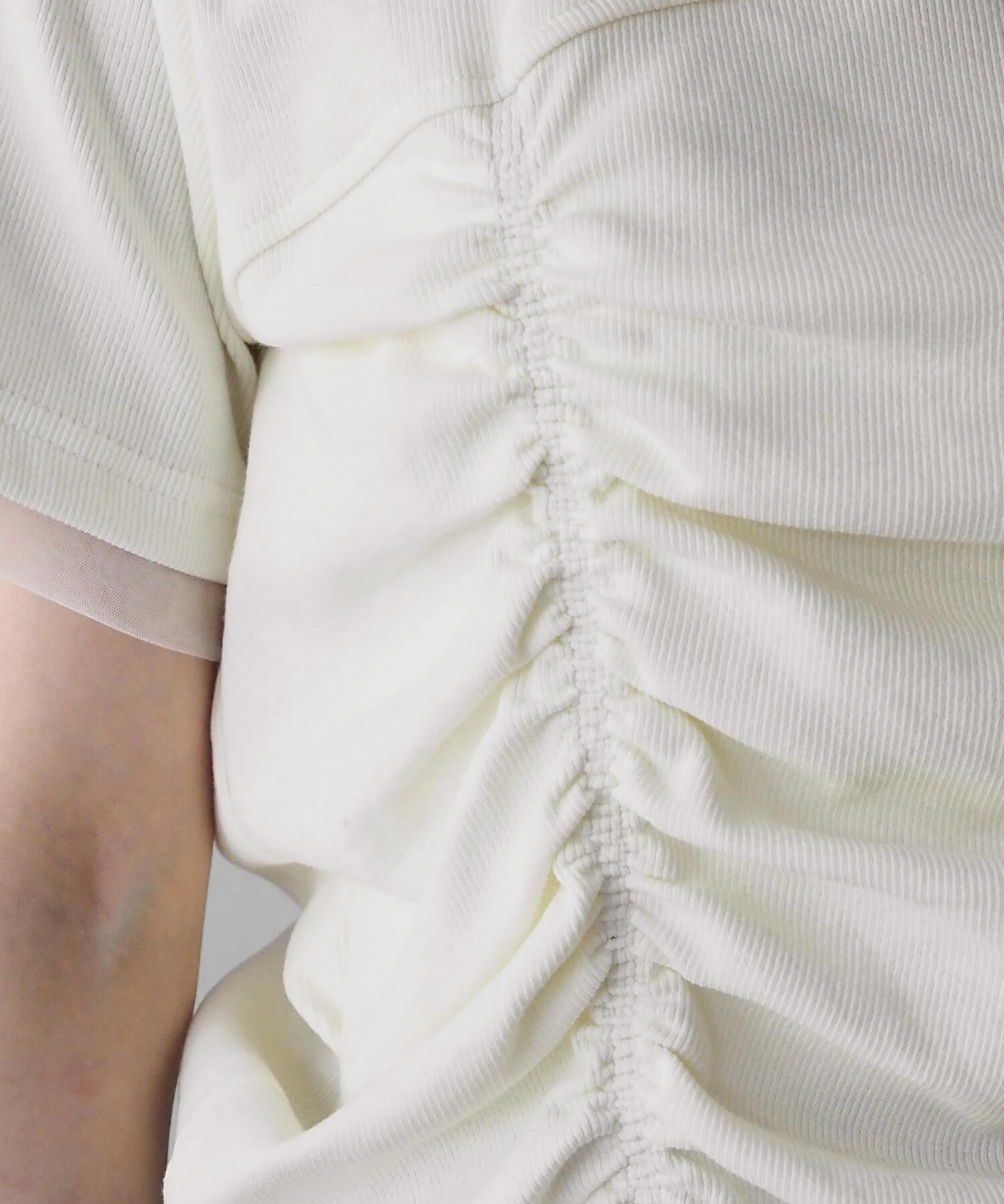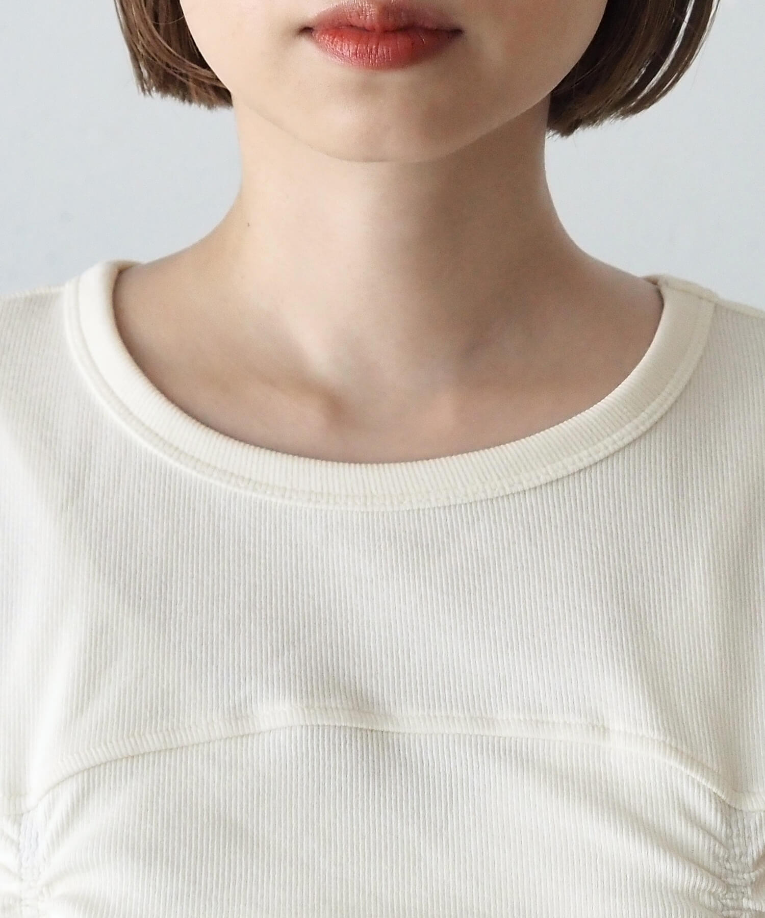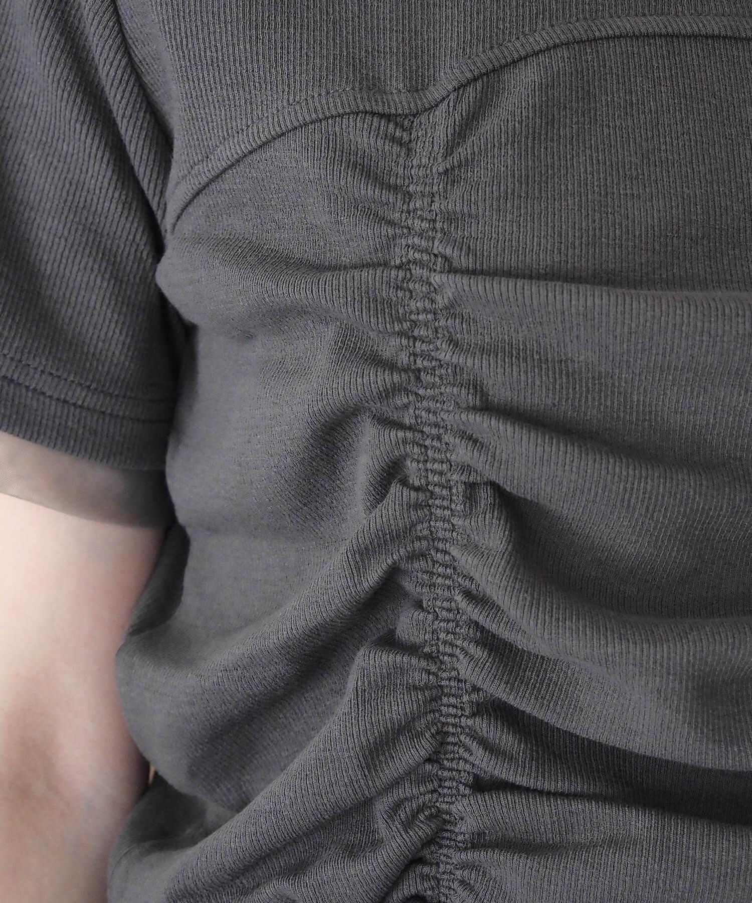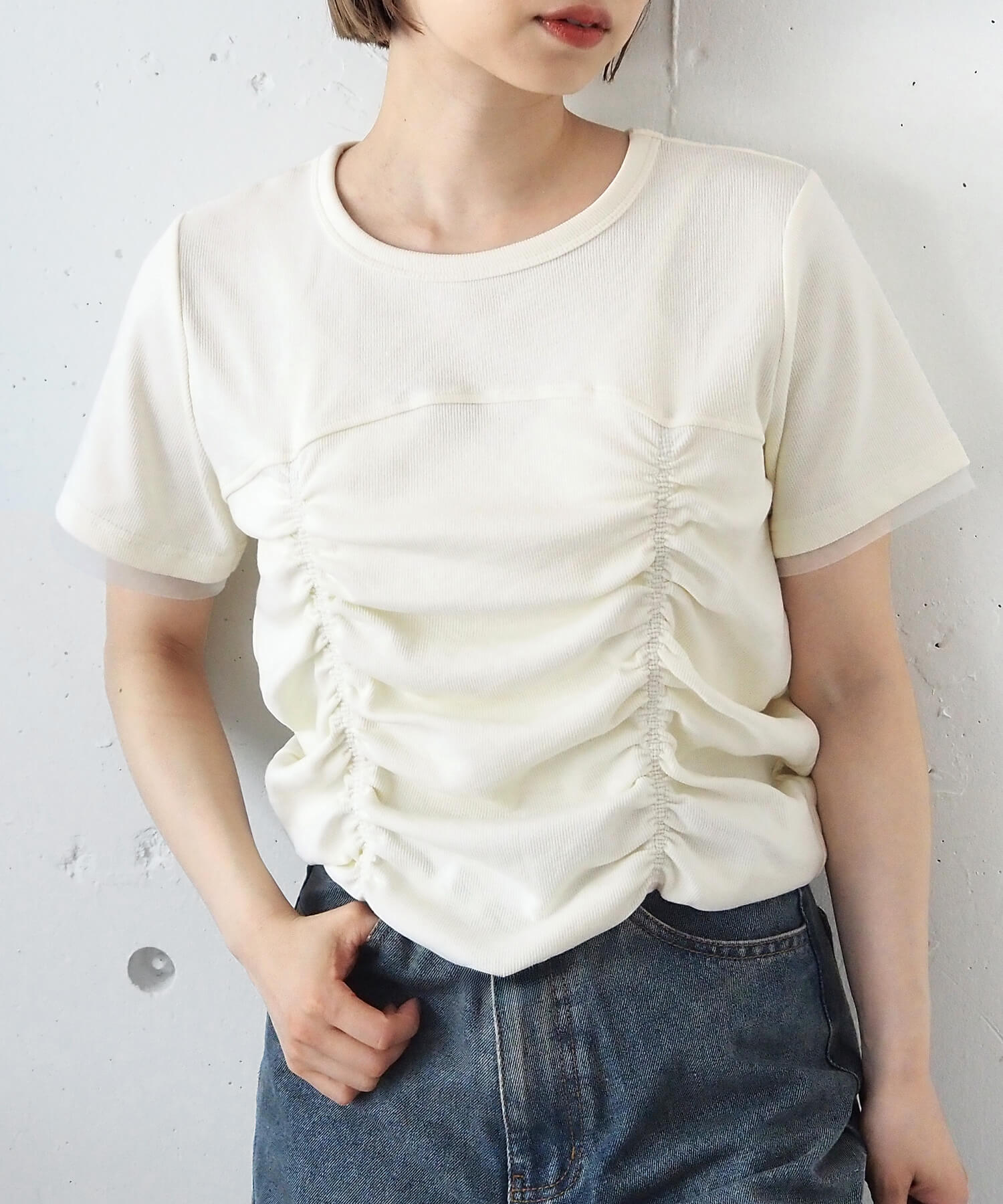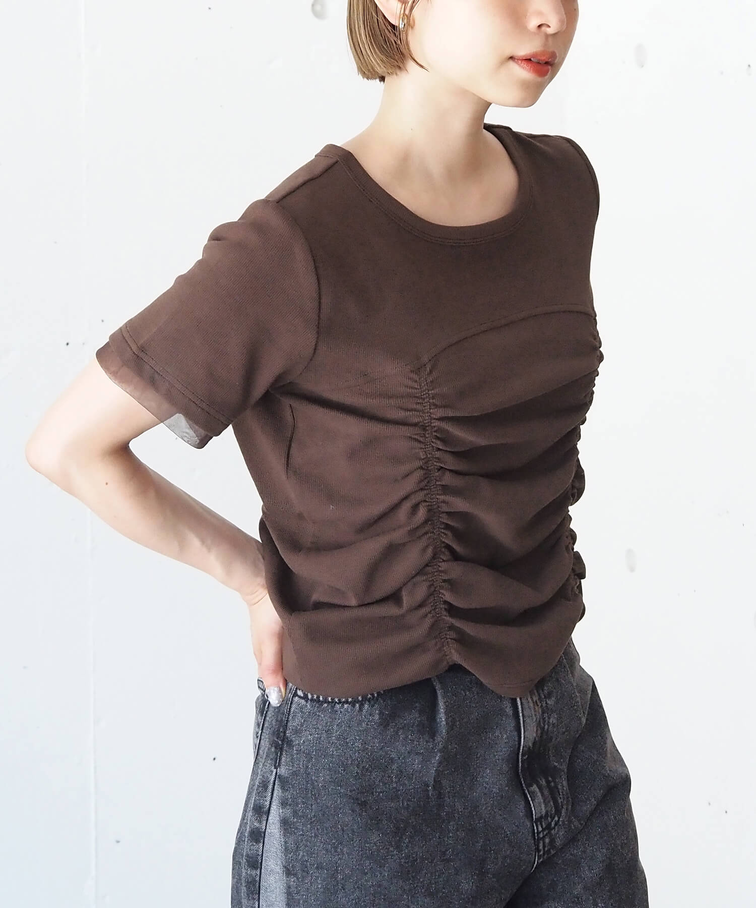 ・トレンドの裾シャーリングとさりげない華やかさが魅力の半袖プルオーバーです。