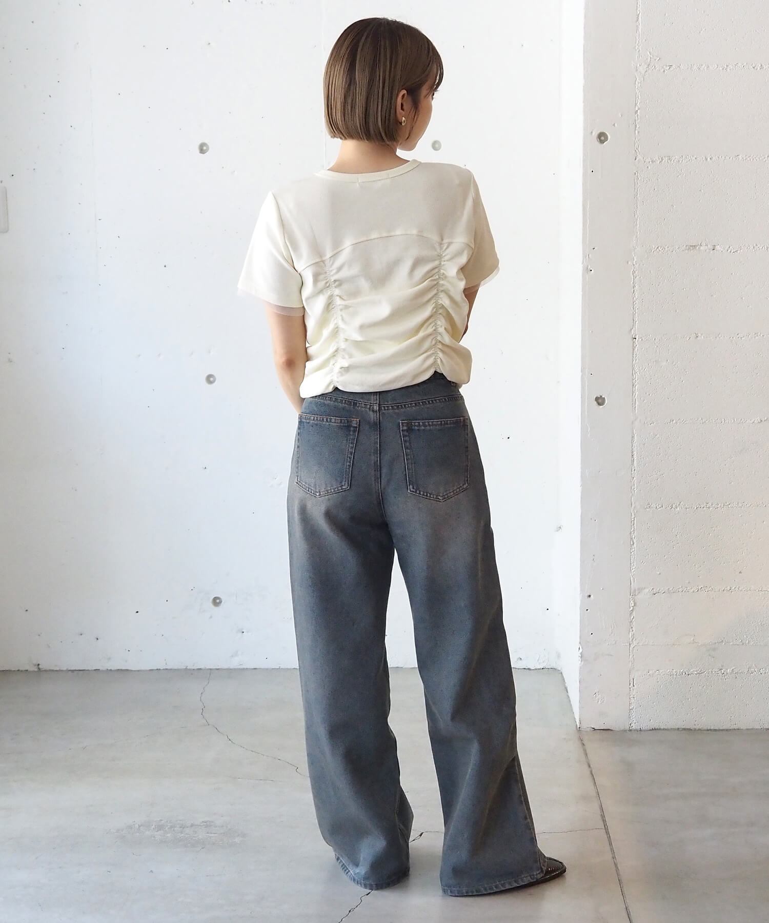 ・裾ドロストや胸の切り替えなど目線が上がるデザインなので、ボリュームがあるワイドパンツも好バランスに決まります。