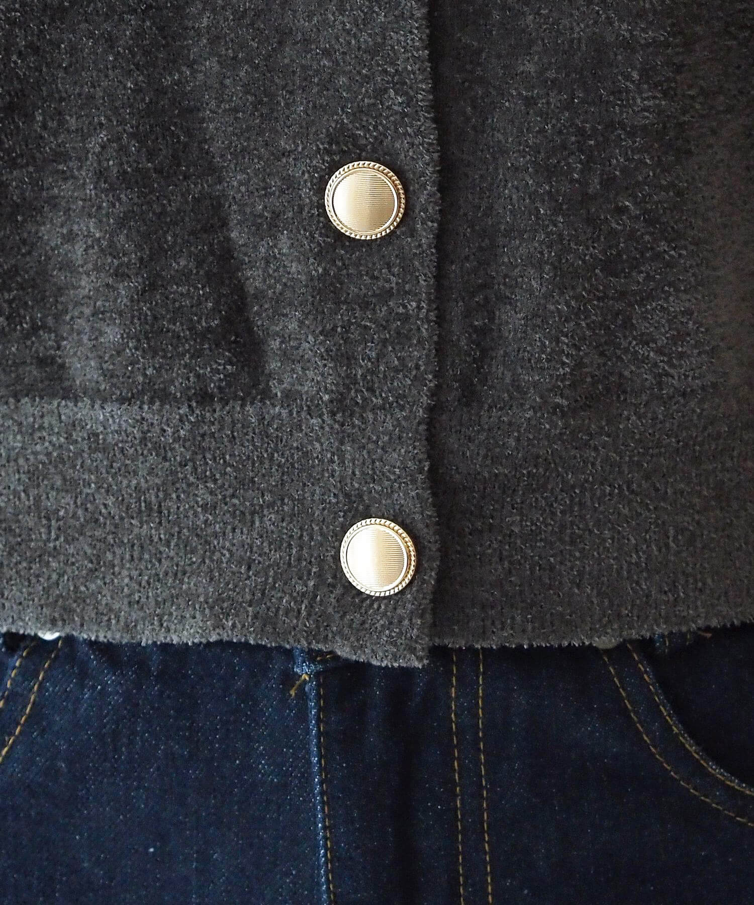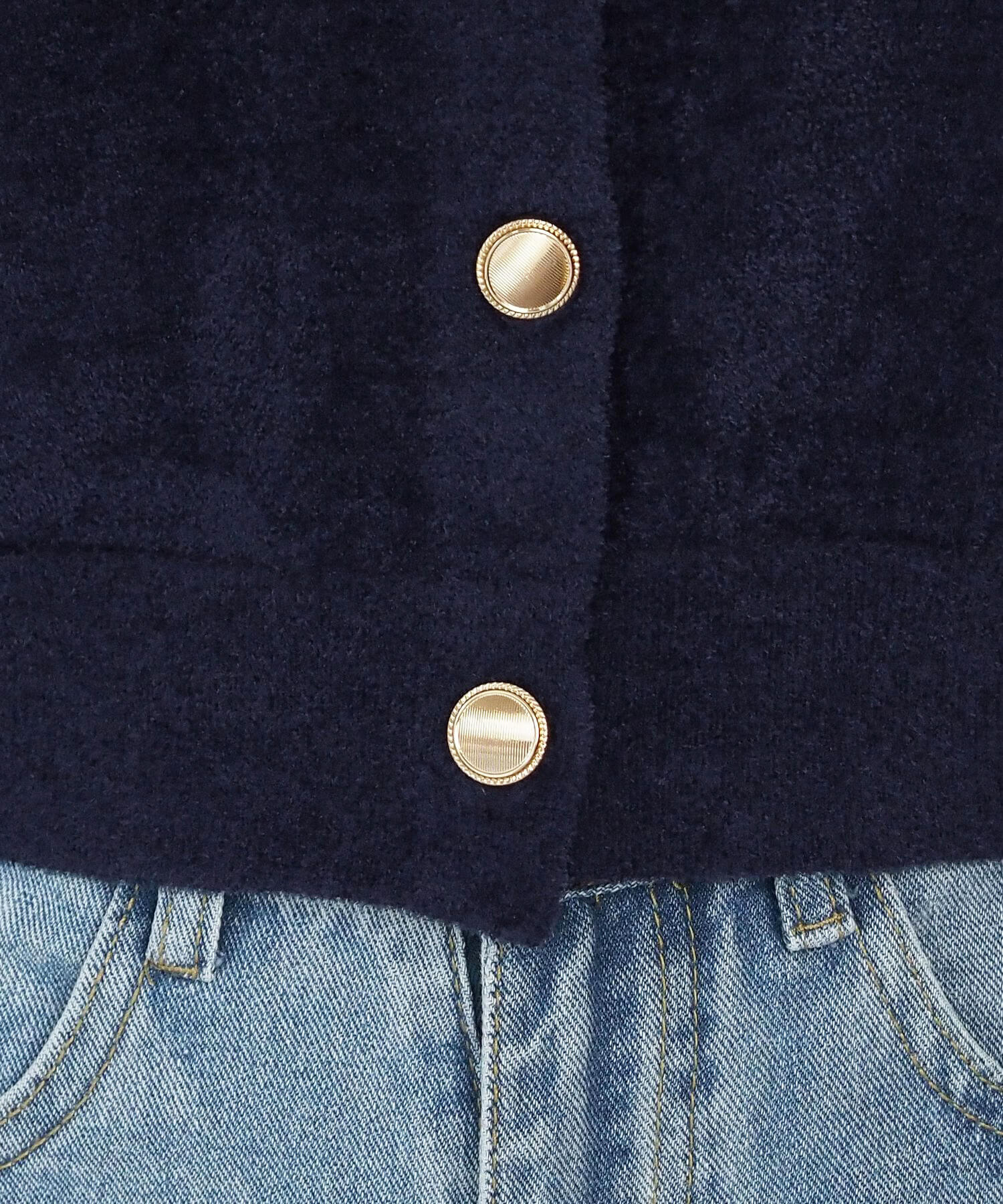 ・金ボタンが目を惹く、表面感が魅力の半袖ニットカーディガンです。
