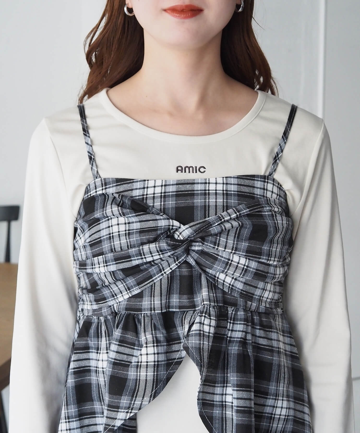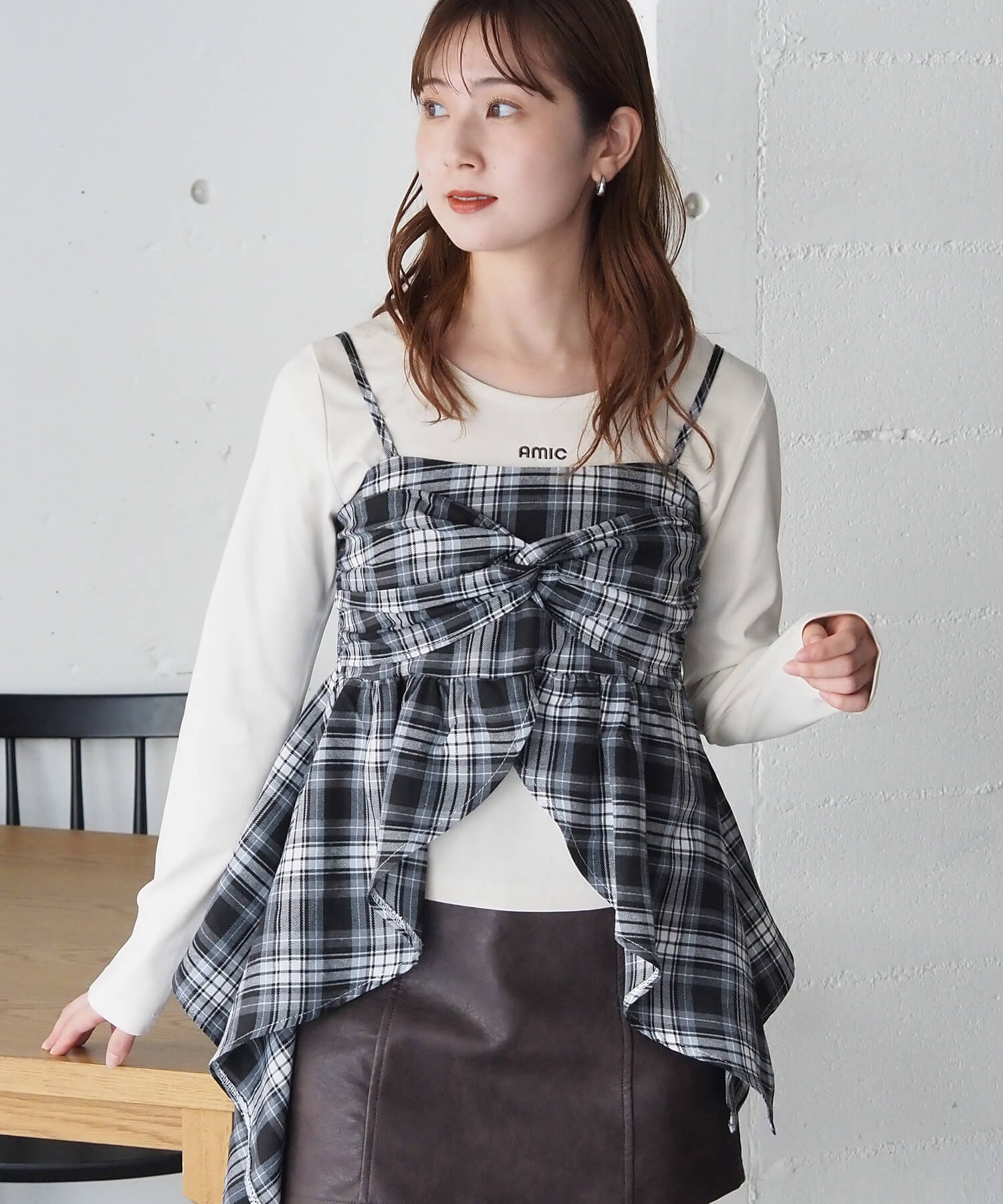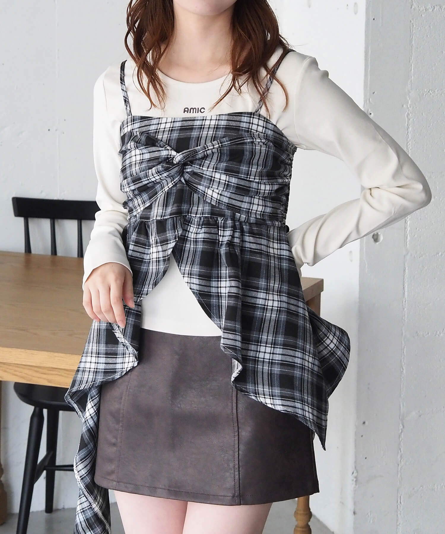 ・胸元のねじりデザインで重心が上がるので、ショート丈のキャミビスチェ感覚で着こなせます♪