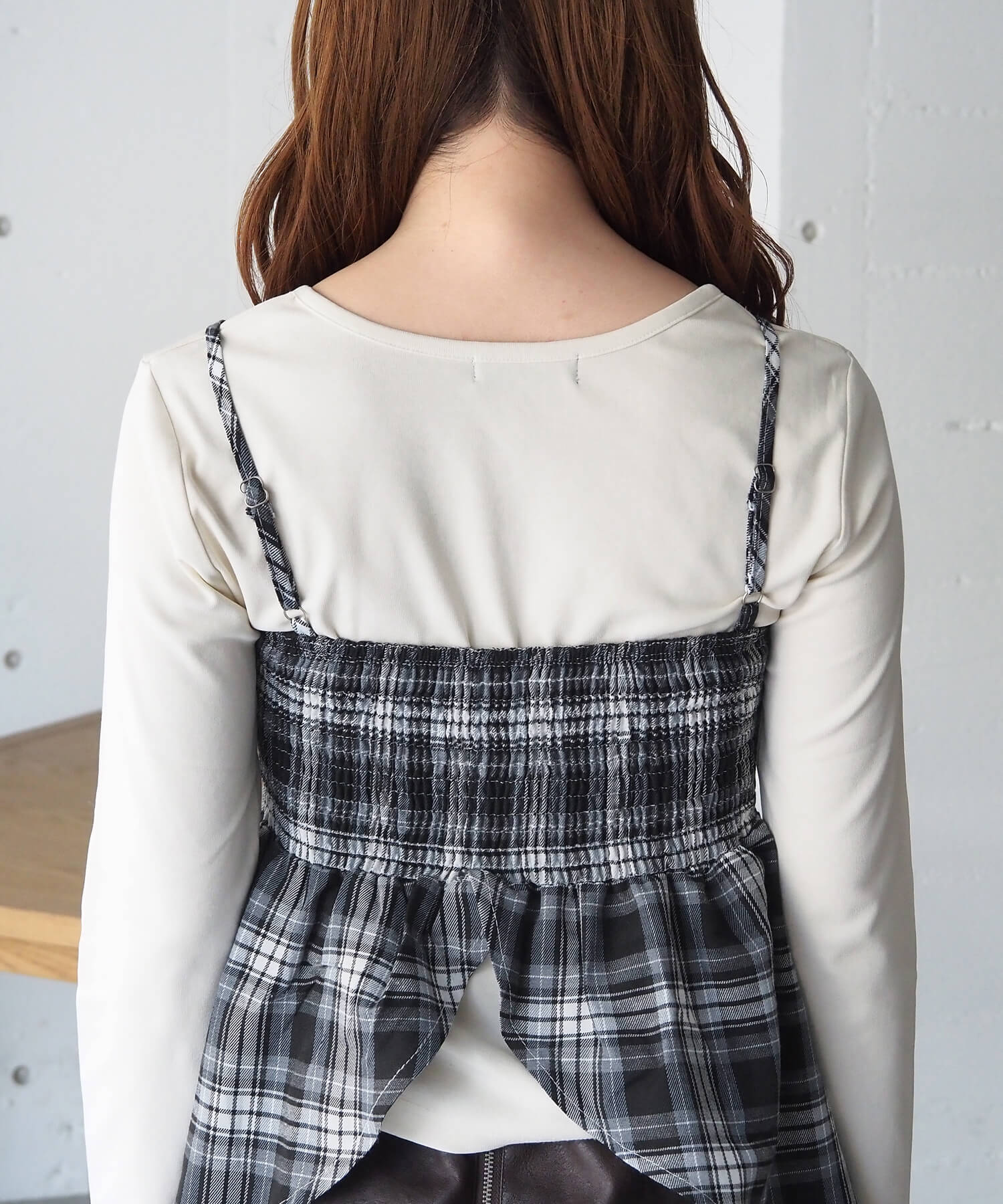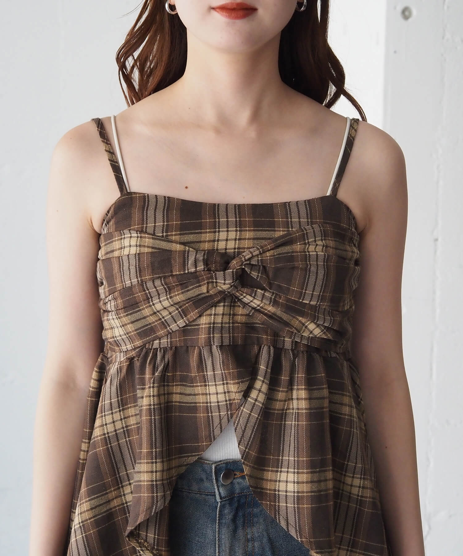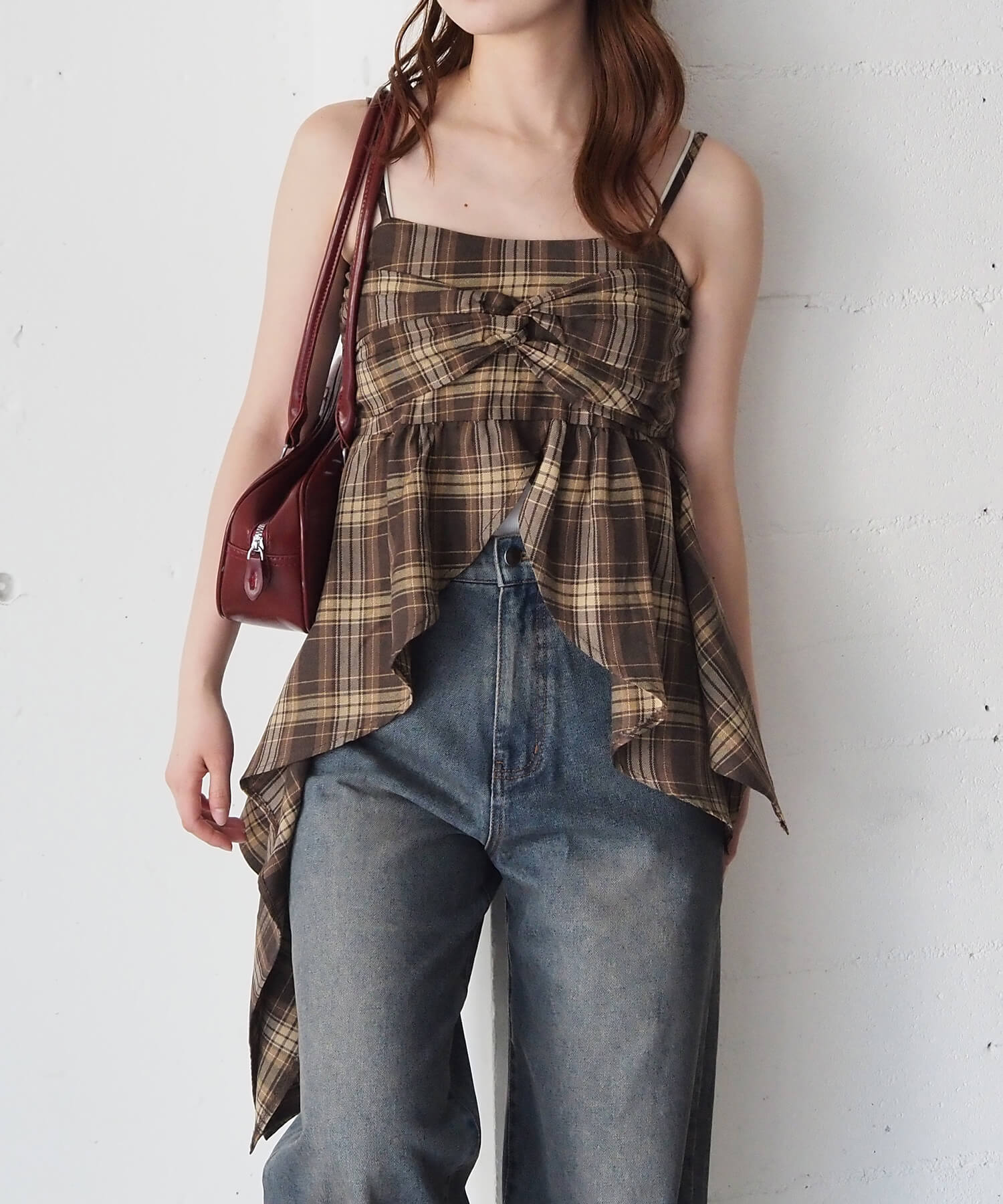 ・胸元のねじりデザインで重心が上がるので、ショート丈のキャミビスチェ感覚で着こなせます♪