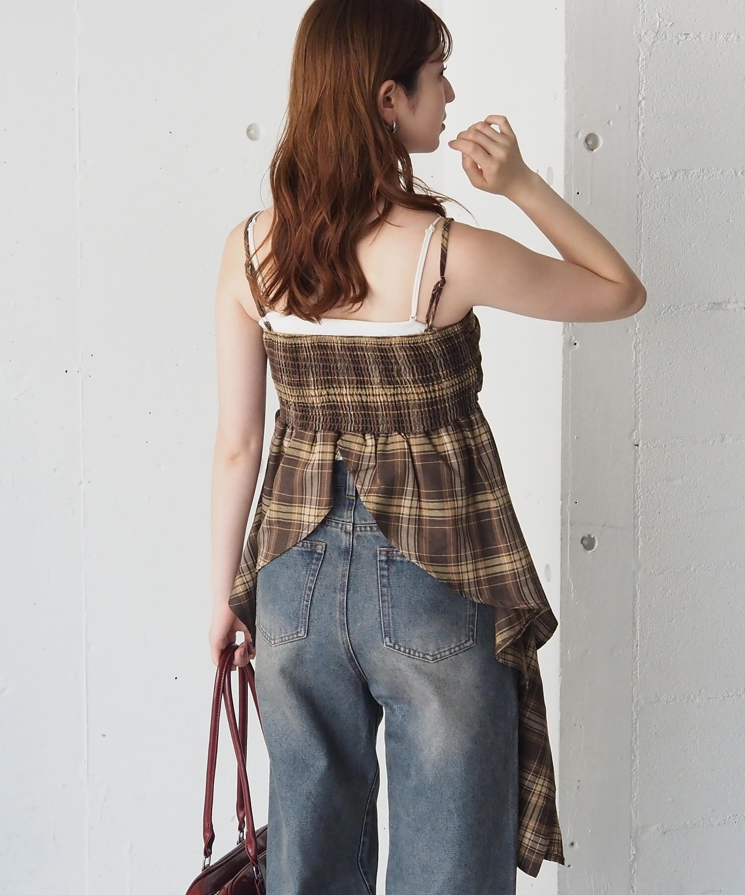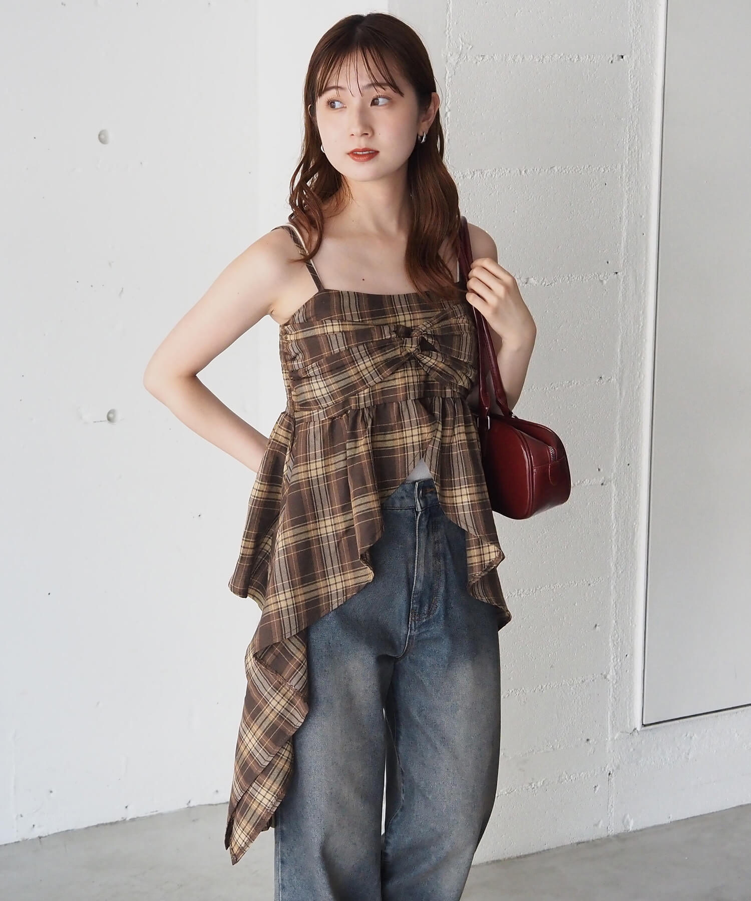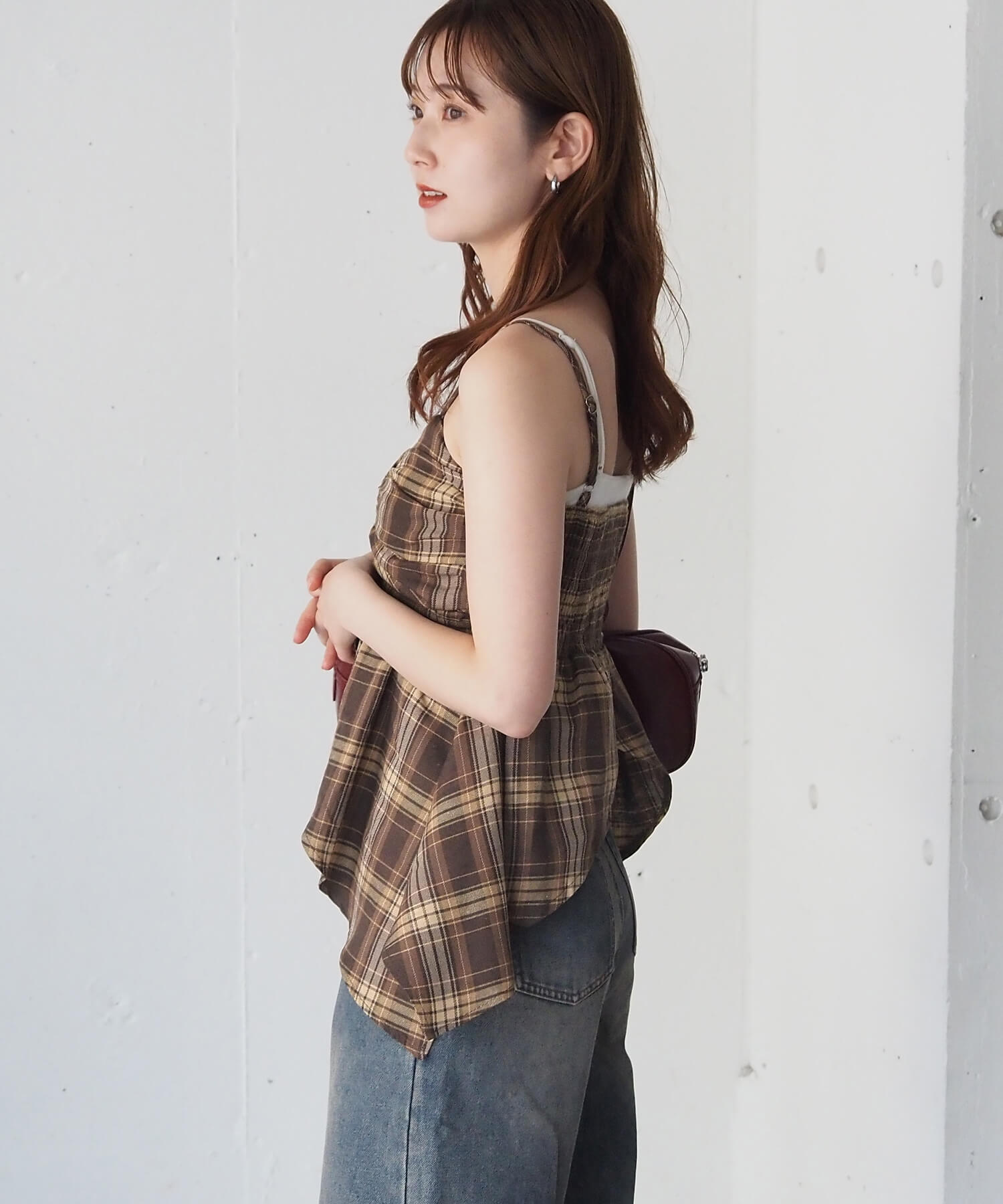 ・まだ暑い日はキャミソールやタンクトップで。デザイン性の高いアイテムなので、シンプルなインナーを合わせるだけで印象的な着こなしが叶います。