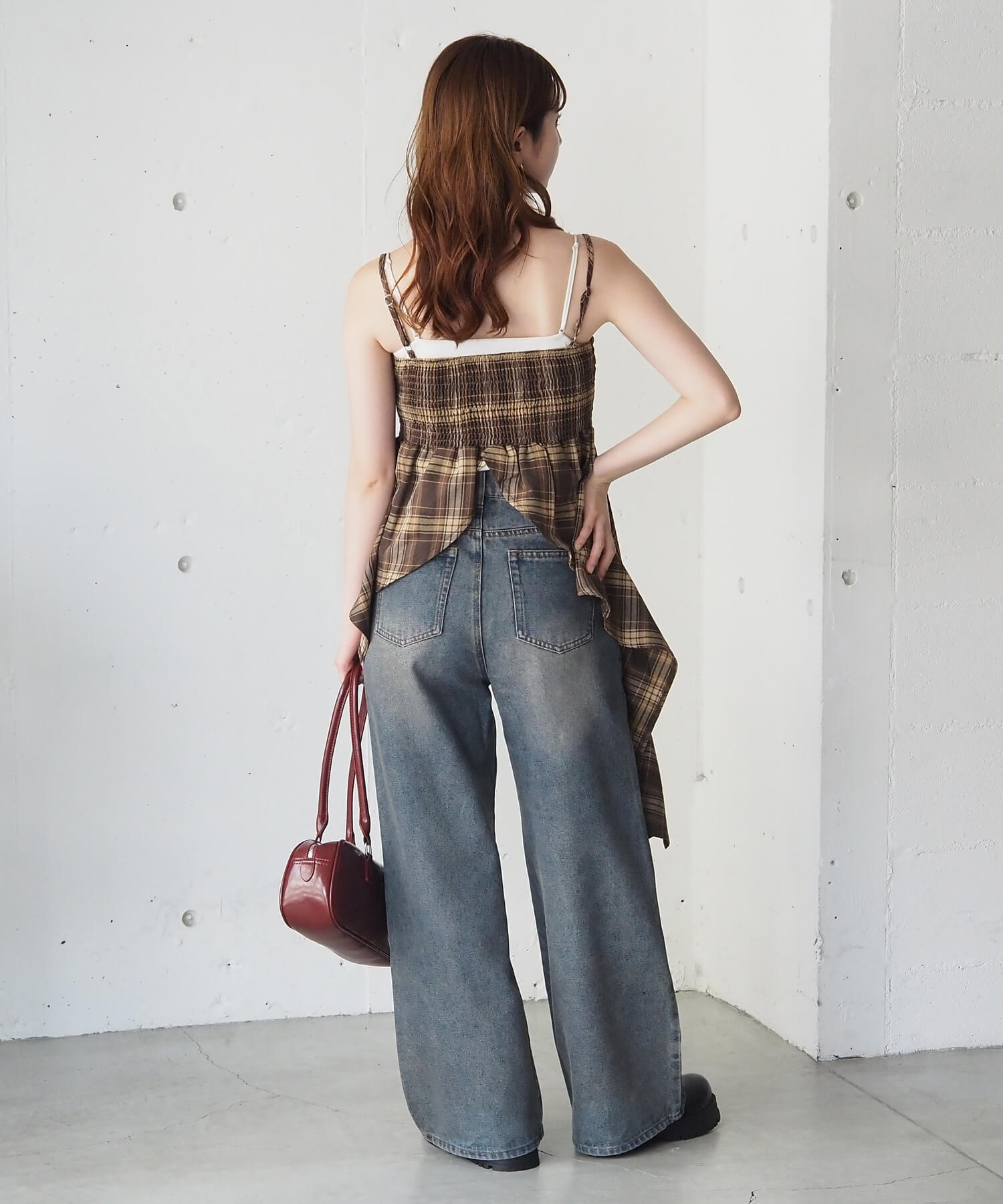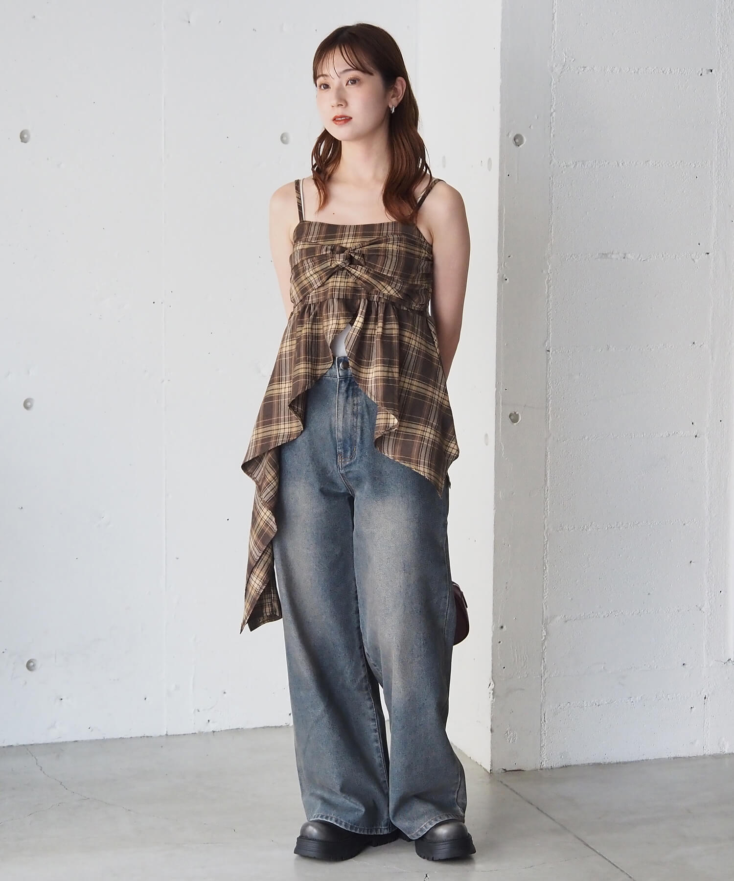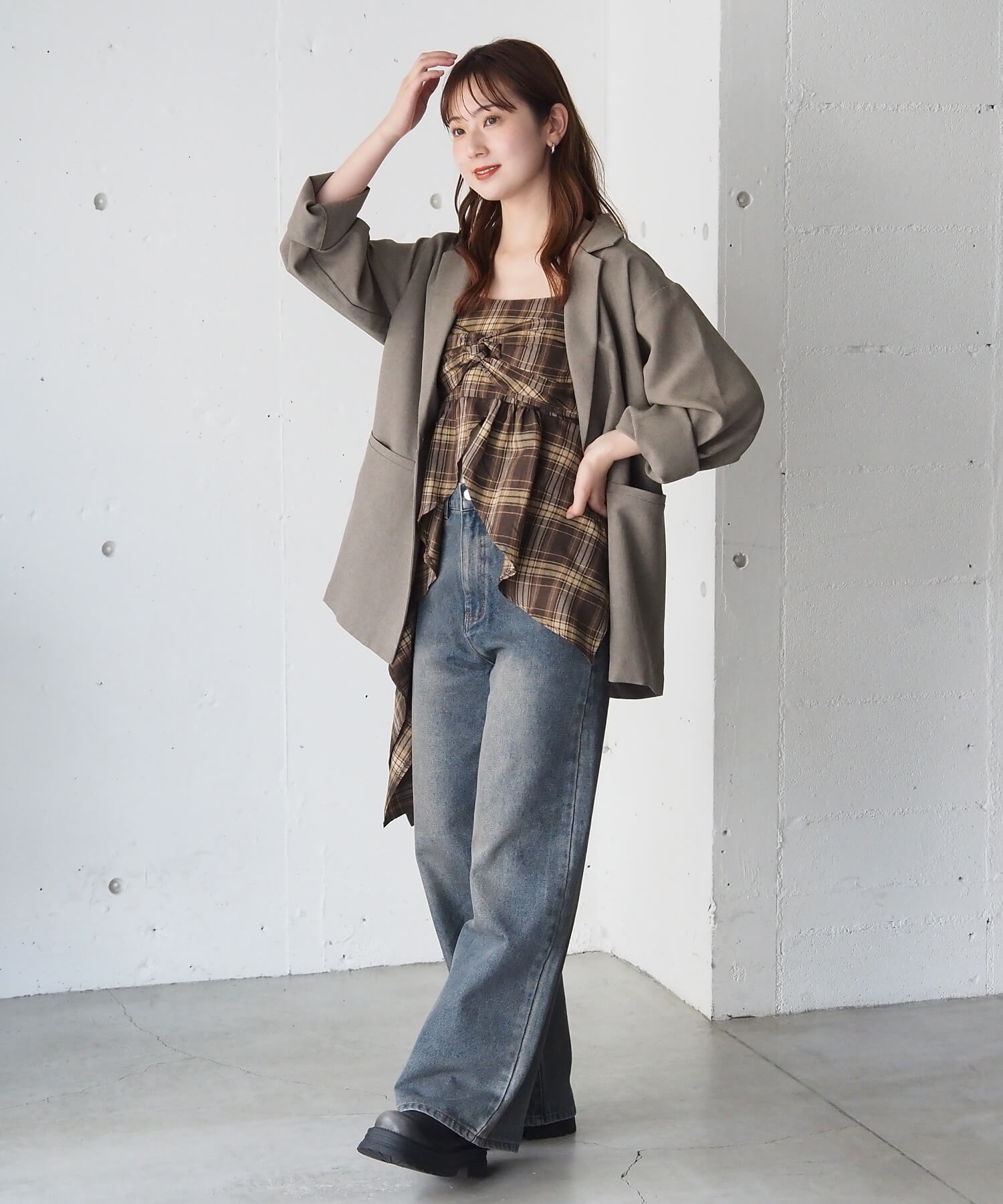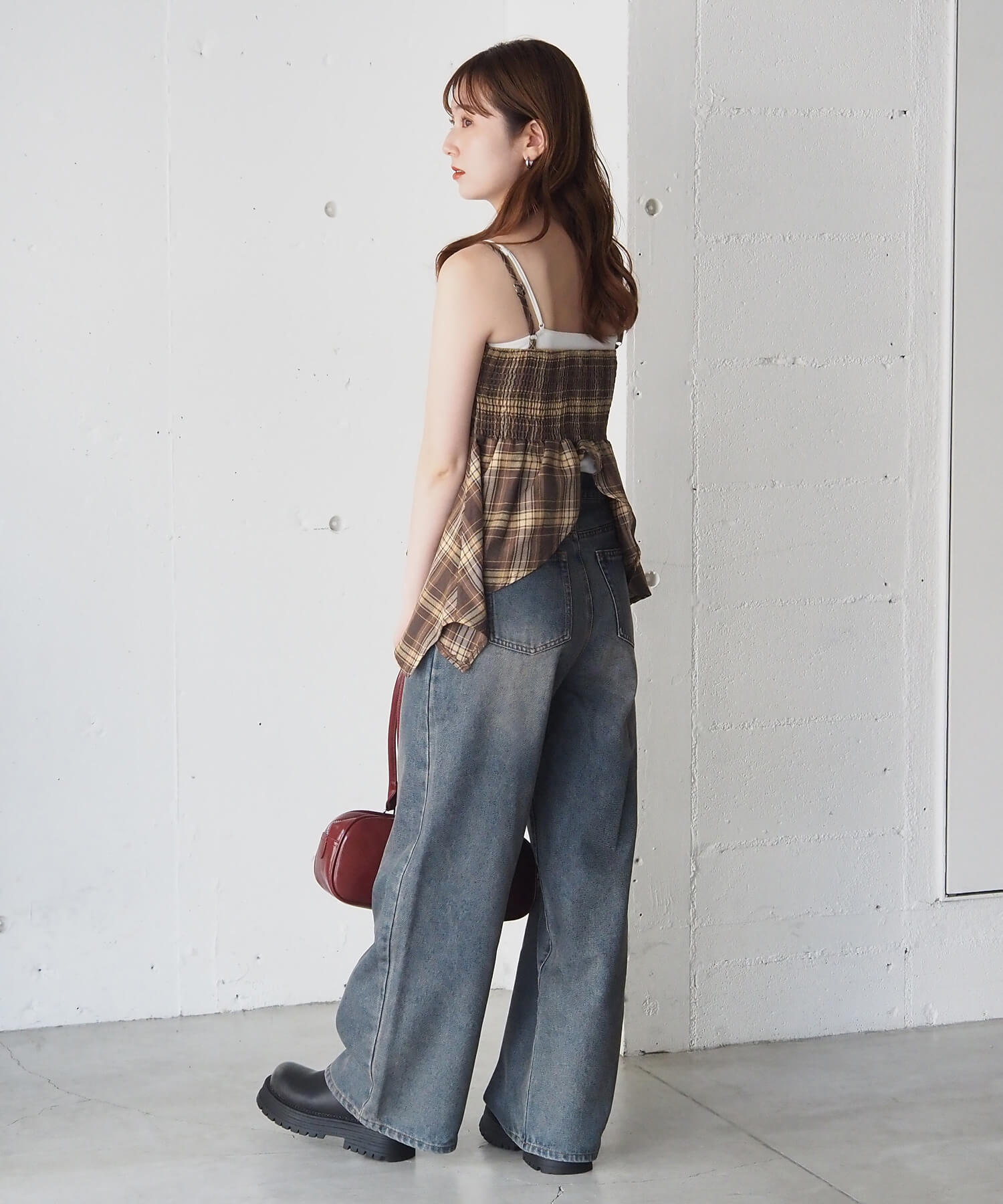 ・まだ暑い日はキャミソールやタンクトップで。デザイン性の高いアイテムなので、シンプルなインナーを合わせるだけで印象的な着こなしが叶います。