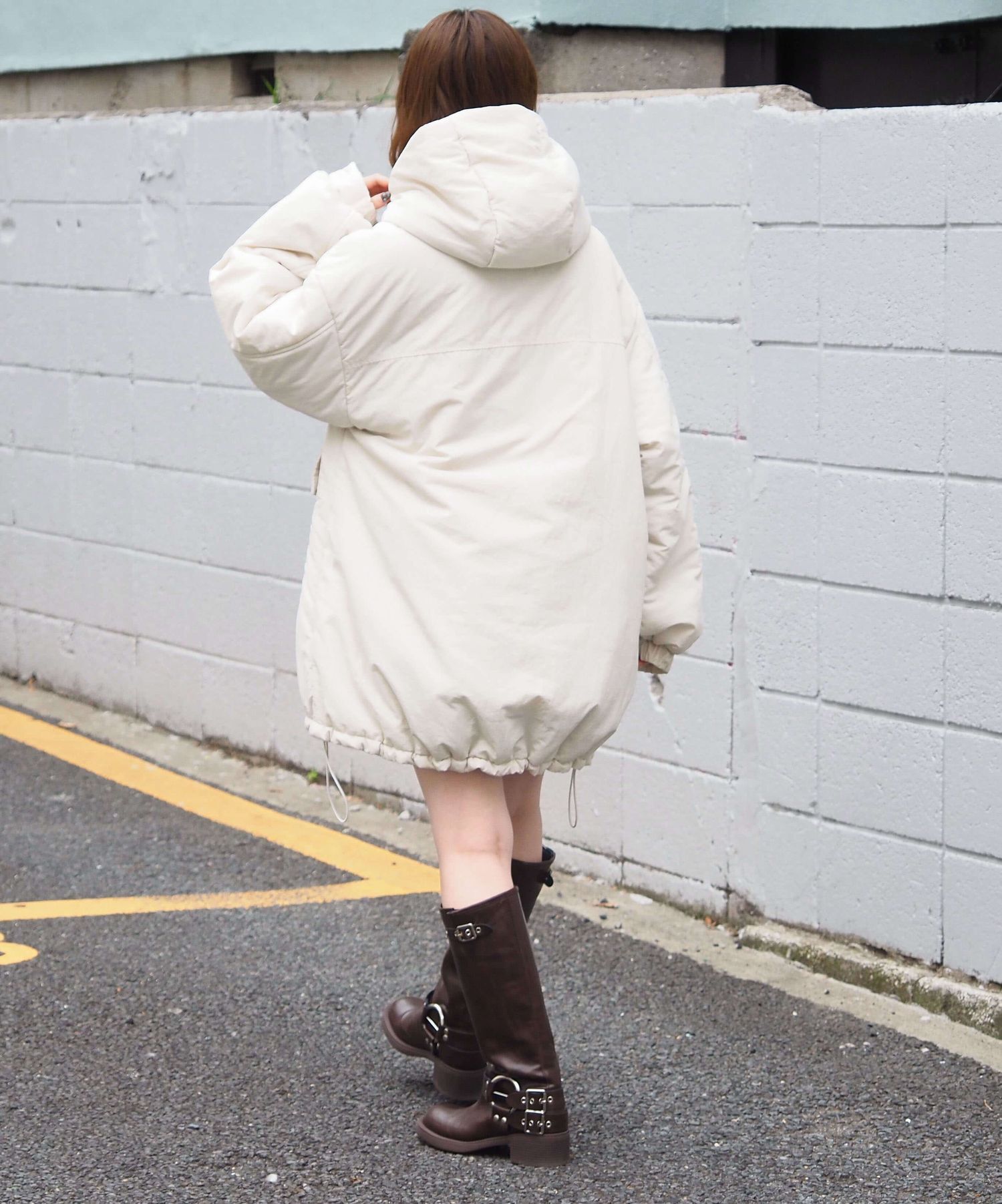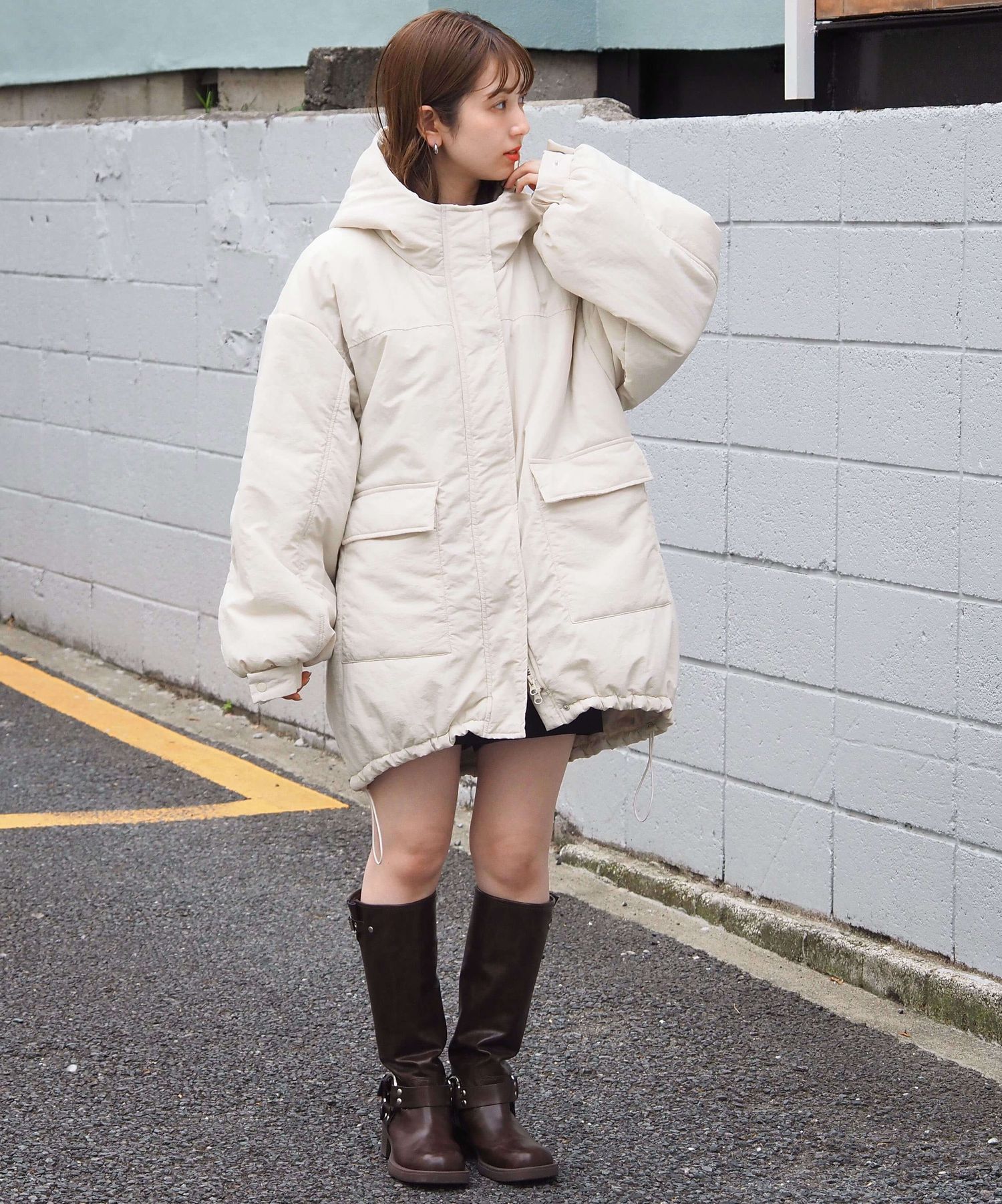 ・ミニボトム×ボリュームブーツでトレンドライクに。ブルゾンのたっぷりボリュームにコンパクトな着こなしが気映えする、おすすめのスタイリングです。足元はボリュームのあるシューズでバランスをとるのが◎