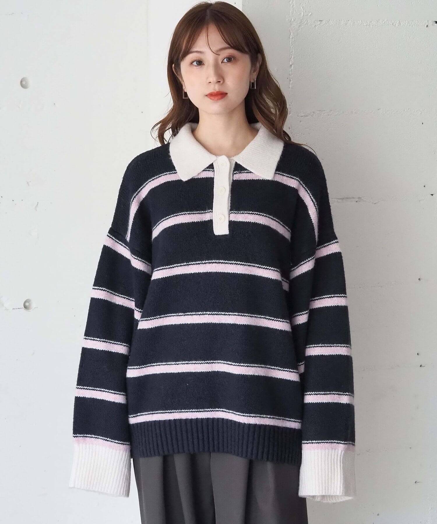 ・スポーティーなラガーシャツデザインに、やや起毛感のあるもちもちニットで女性らしさをプラスし、上品に着られる1着に仕上げました。