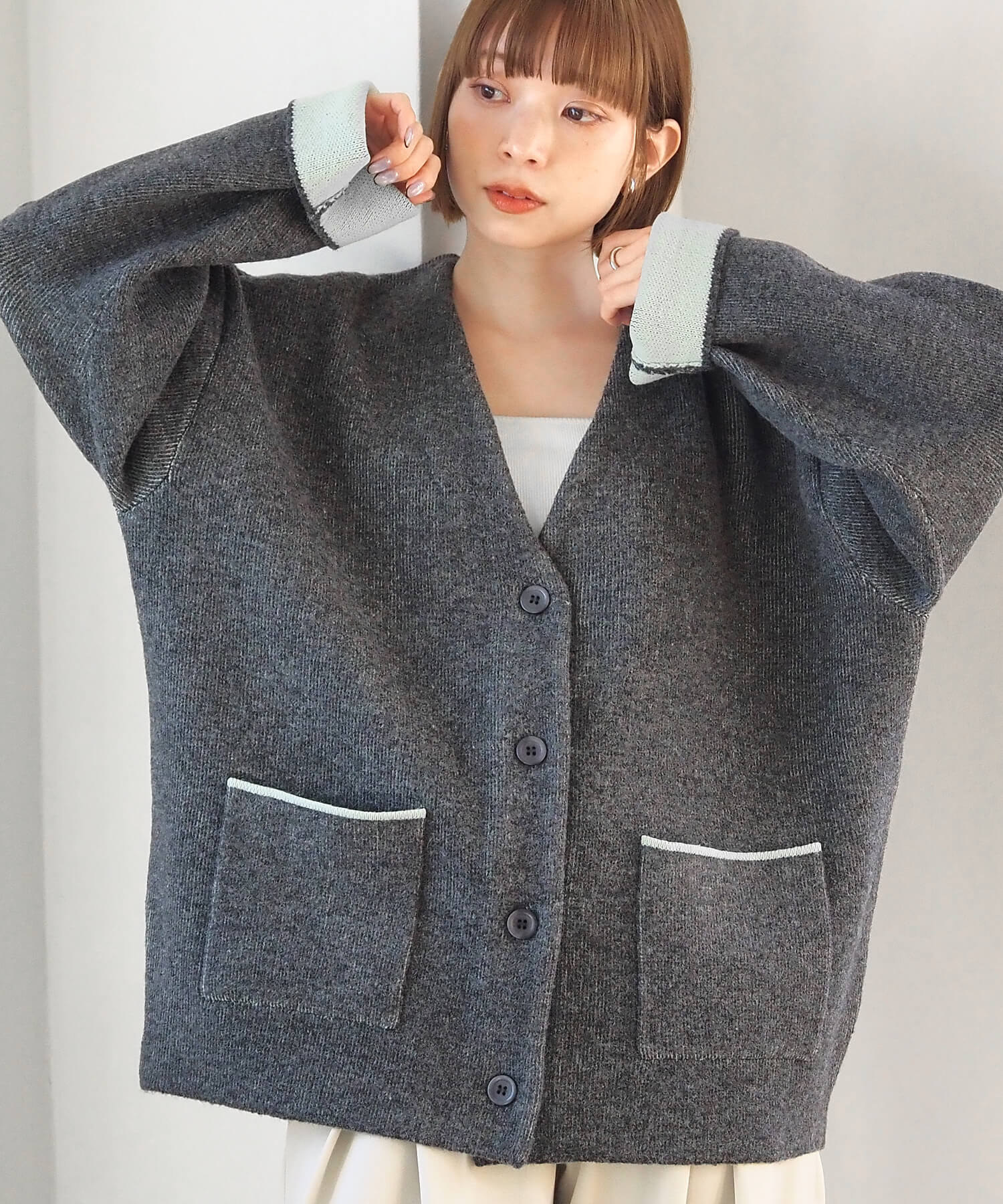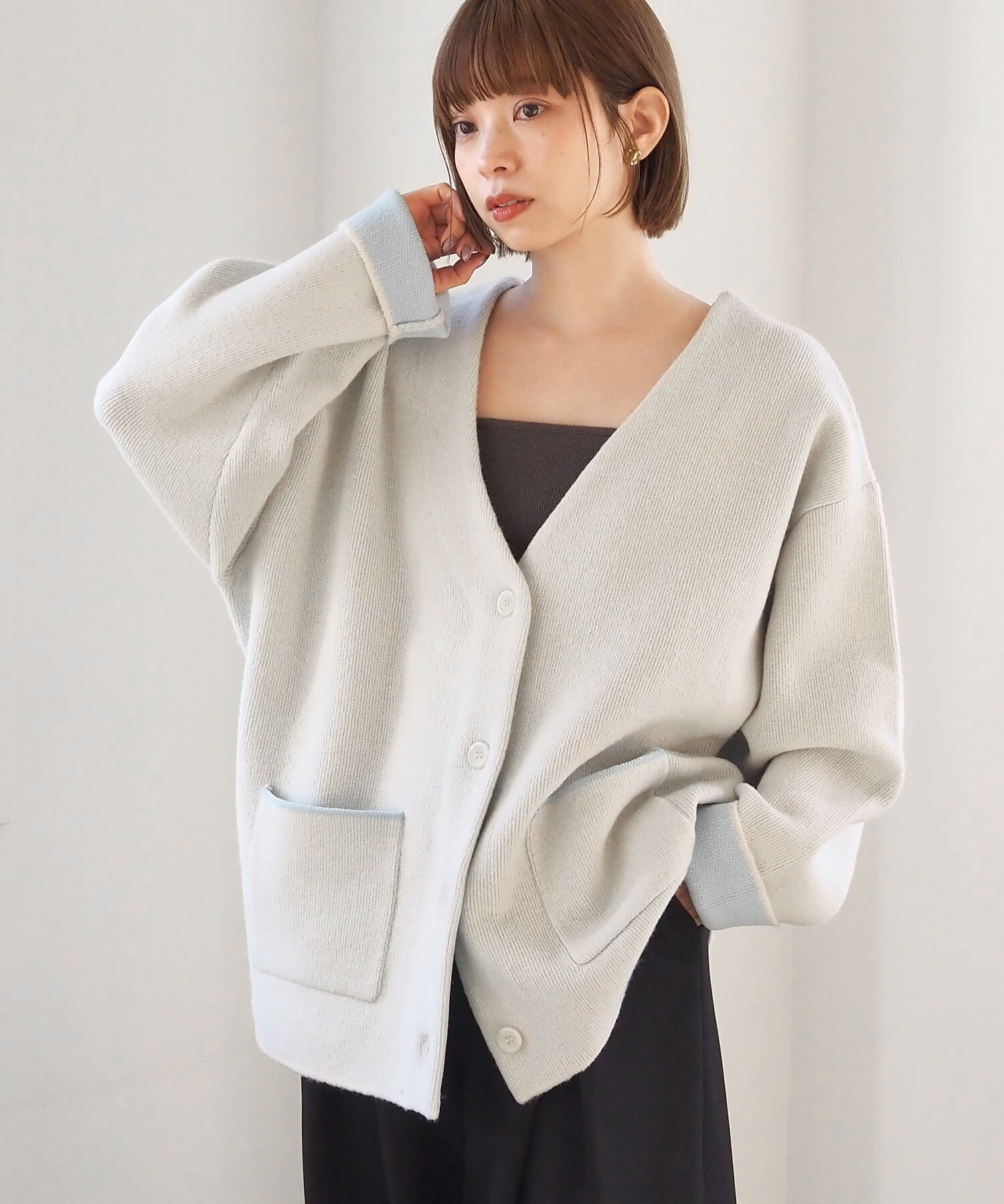 ・バイカラーデザインが着映えする、VネックのBIGカーディガンです。
