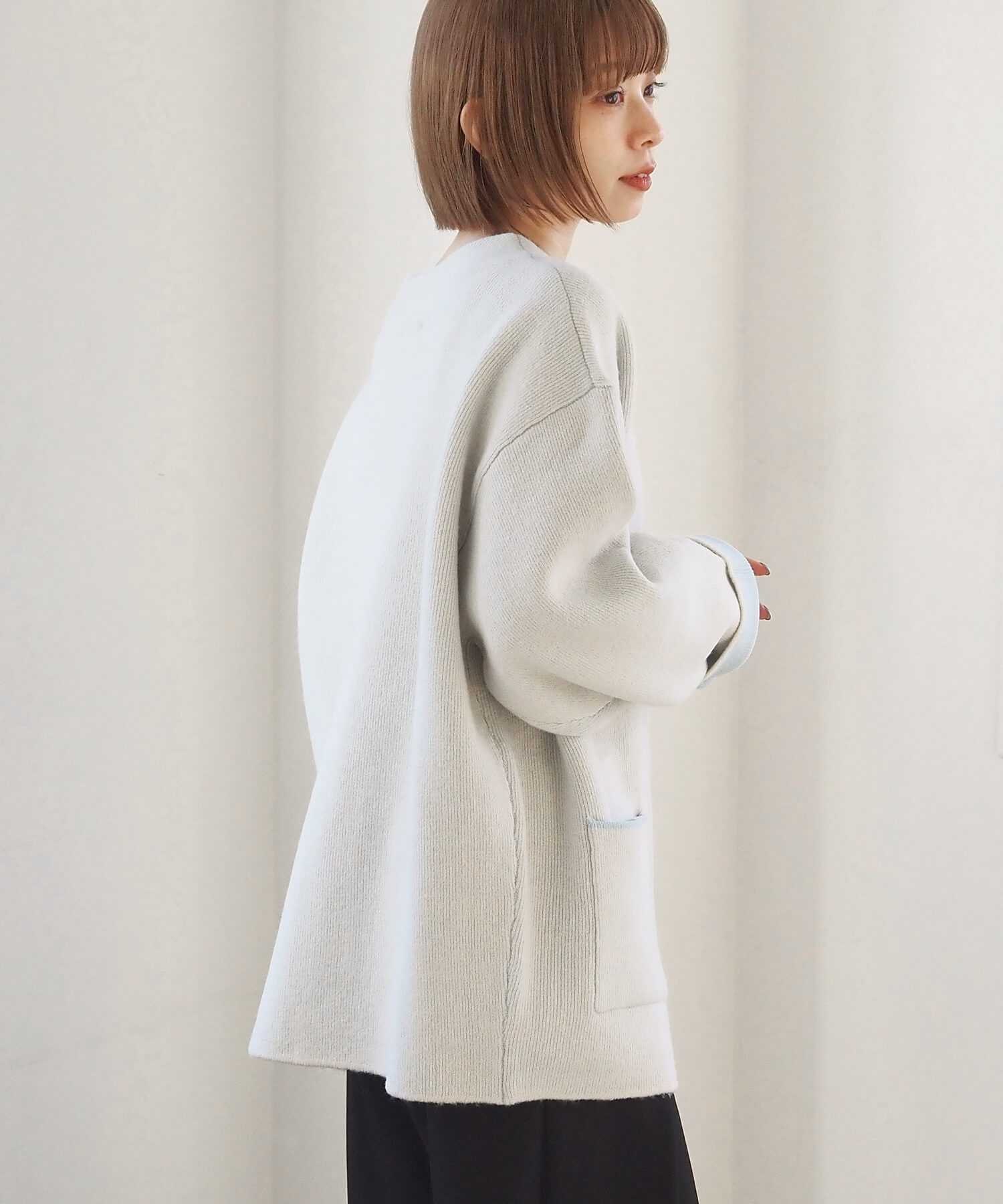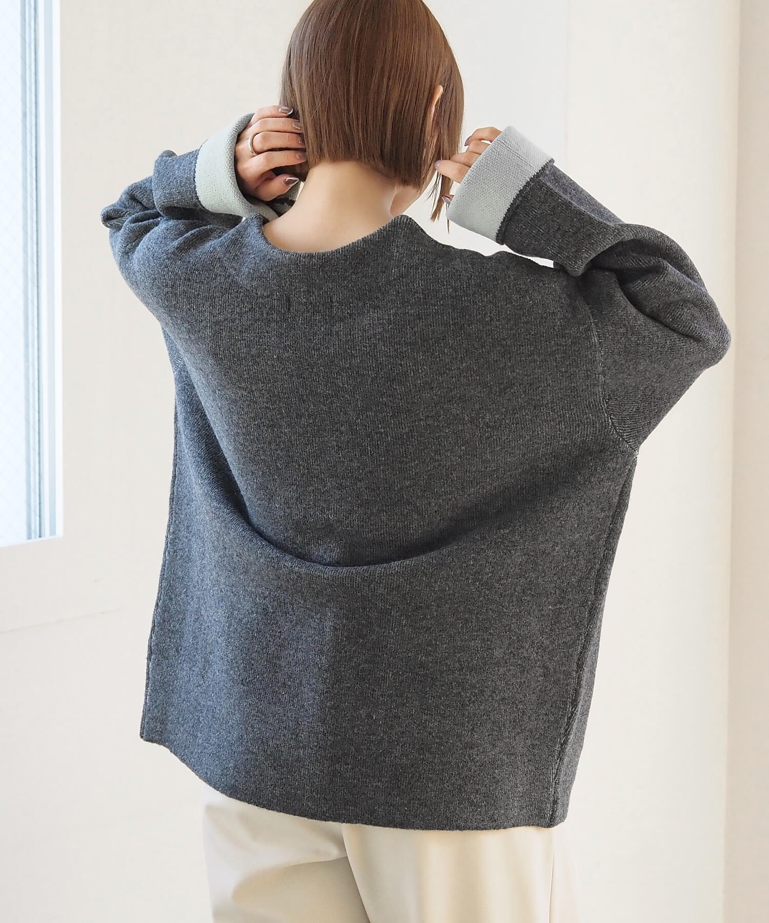 ・2色のニットを合わせたダブルフェイス仕様なので、袖の折り返し幅は気分でアレンジが可能。