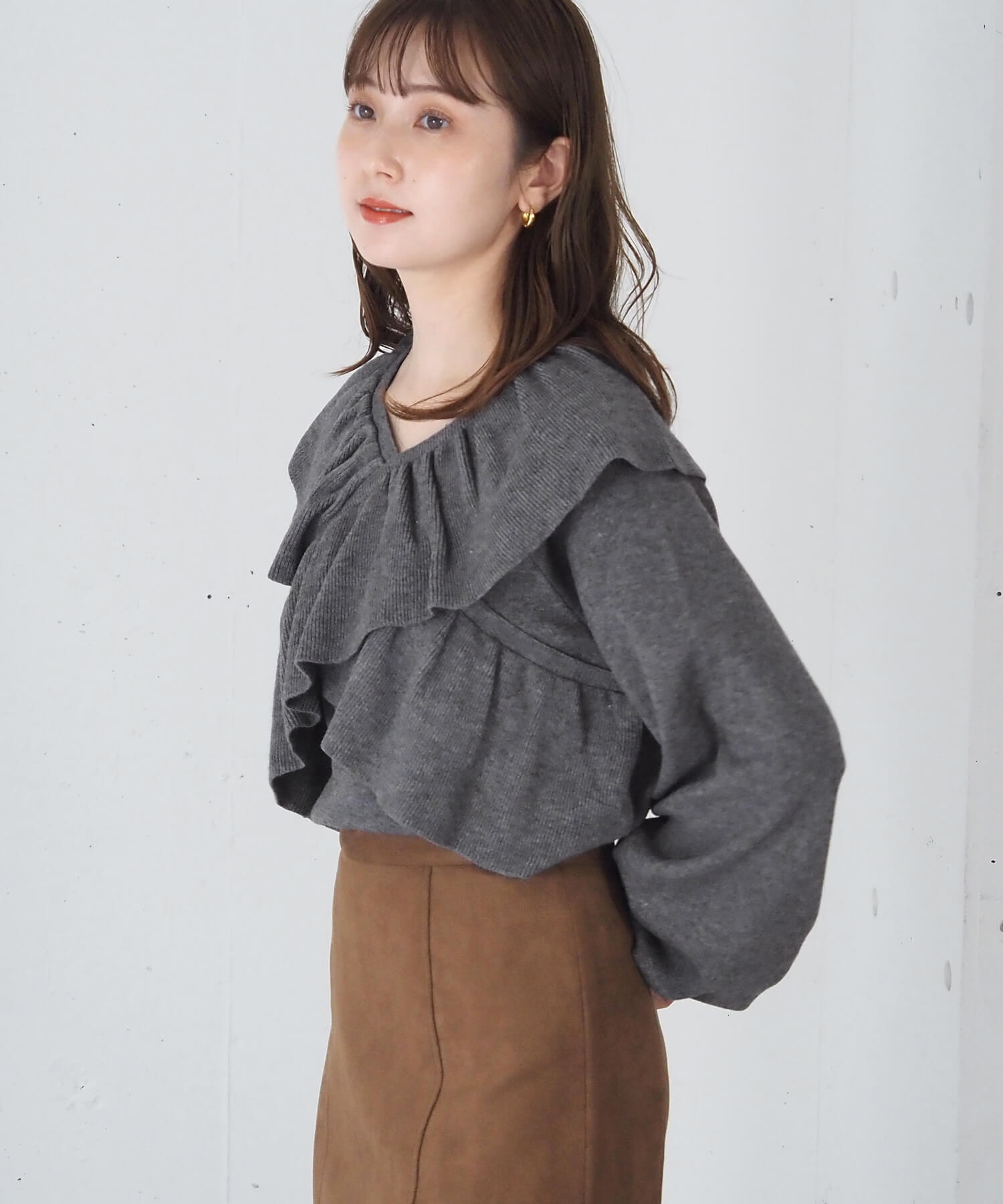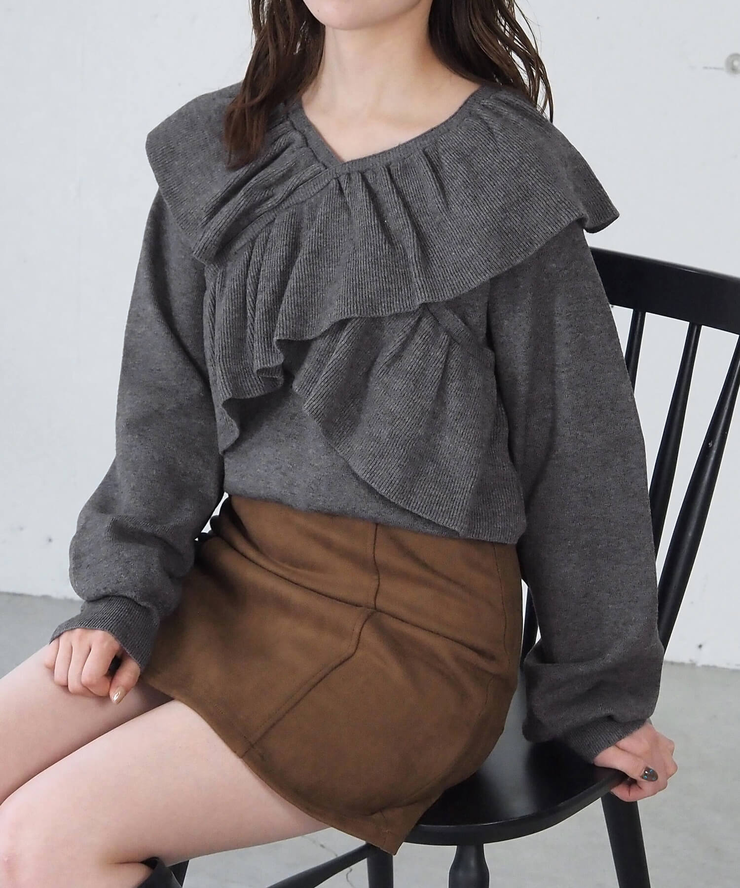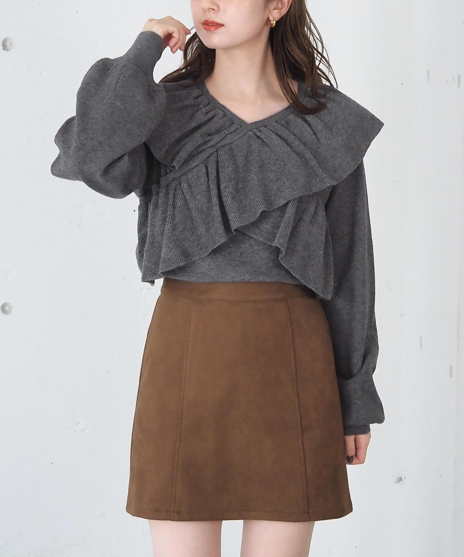 ・スウェード生地やレザーでトレンドコーデに。たっぷりのフリルデザインやリブ使いで華やかな高見えコーデが完成します。