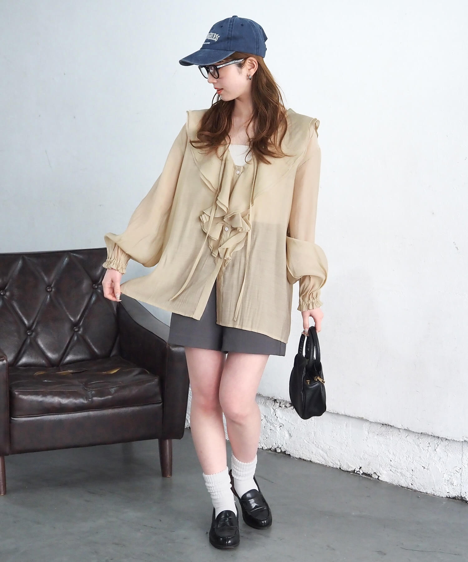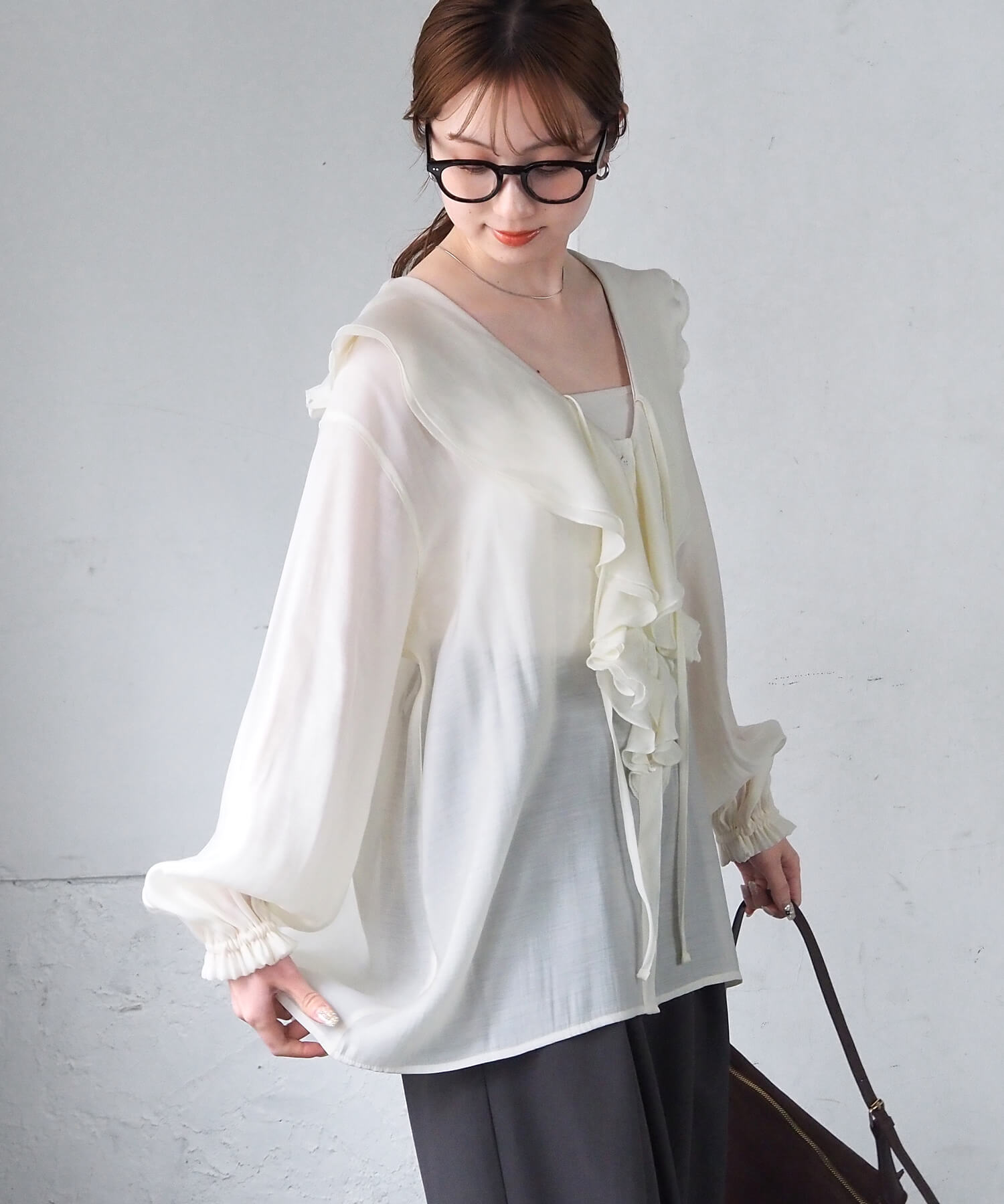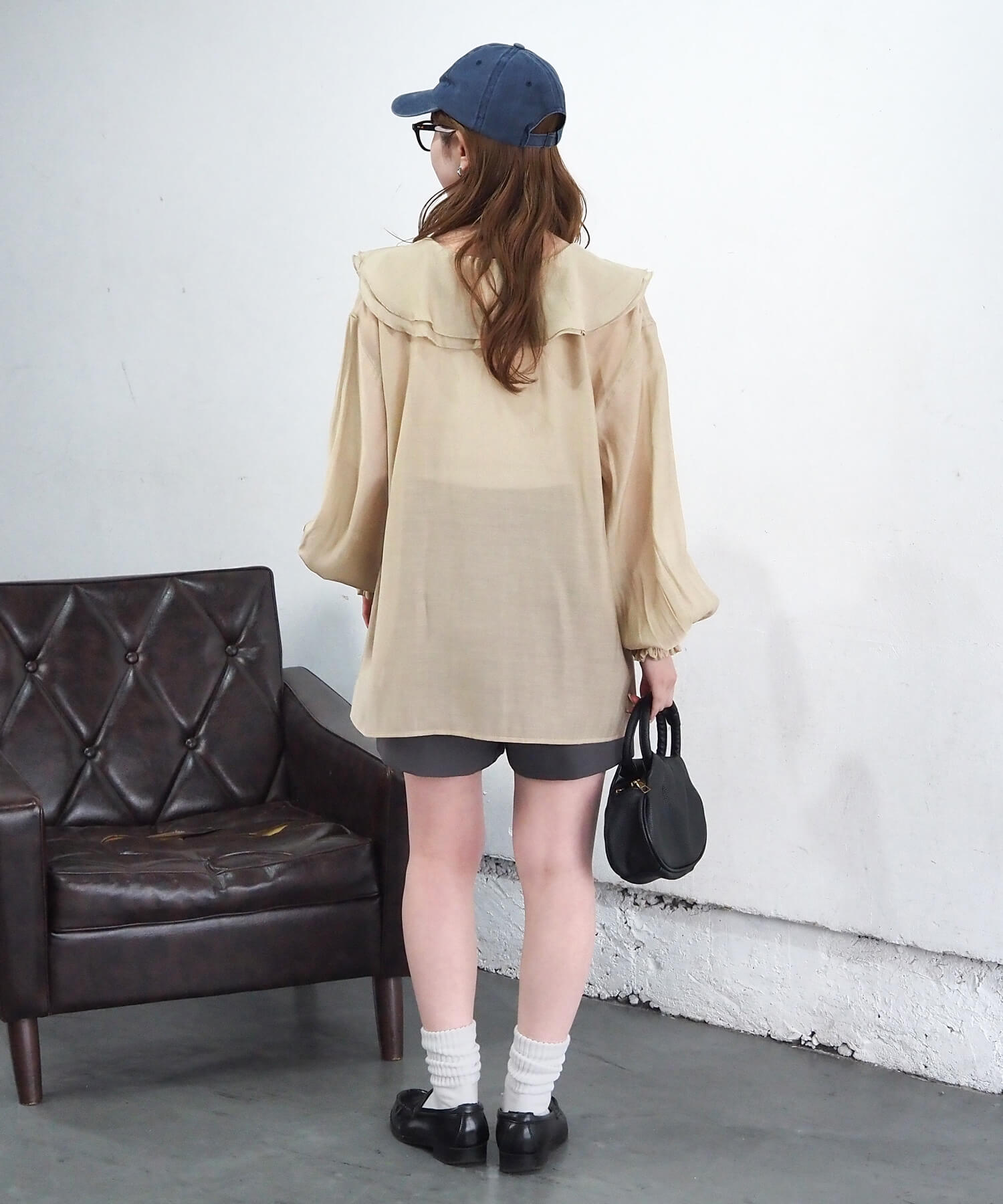 ・大ぶりなフリル襟がキャッチーなシアーブラウスです。